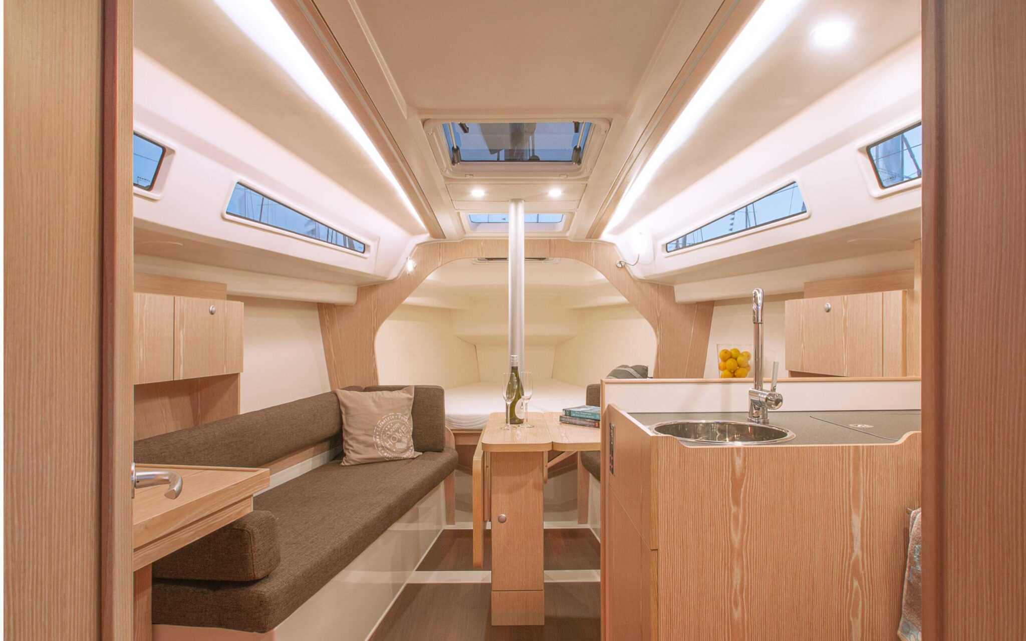 Bent világos és tágas a tér. A karcmentes üvegtáblák és a hajó oldalába vájt műanyag ablakok rengeteg fényt és levegőt engednek be. Hasonlóan méretesek a konyha körül, a szalonban és a kabinokban elhelyezett tárolórekeszek. Öten kényelmesen elférnek a beltérben, és mindenkinek jut kényelmes fekhely, mert a szalon kanapéja is elég hosszú egy felnőtthöz. A közlekedőrészen 1,91, míg az orrban 1,77 méter a belmagasság. Ezt a gyártó a padló szintjének süllyesztésével érte el, ügyelve arra, hogy a külalak elegáns vonalvezetése megmaradjon. Mivel nem próbáltak három kabint bepréselni a 32 lábas hosszba, bőven maradt hely a fürdőnek, ami az egyik legnagyobb ebben a kategóriában.