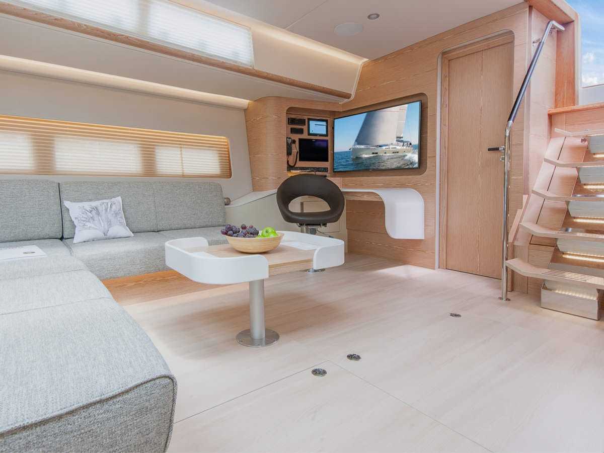 A magánjellegű hajózás frontján egészen új dimenziót nyit a hajóbelső: egyedi bútorai jól tükrözik a tulajdonos kifinomult ízlését és vitorlázás iránti szenvedélyét. A belterek mindegyike jócskán meghaladja az eddig elfogadott sztenderdeket, a lekerekített sarkokon, finoman kidolgozott részleteken élmény végigpillantani. Nem kétséges, hogy ezekben a légies helyiségekben bárki jól érezheti magát. Természetesen a tulajdonosnak van a legjobb dolga, az egész orr az övé, körbejárható franciaággyal (vagy falhoz tolt fekhellyel, hogy szemben elférjen egy kanapé), gigantikus fürdővel, saját televízióval. Talán az egyik legstílusosabb elem is a szalonhoz kötődik: az L alakú médiasarok, amelynek egyik felében a chartplotter, a kapcsolótábla és a VHF-rádió kapott helyet, míg a fedélzeti szórakoztató-rendszer irányító szervei (és egy televízió) került a másikra.