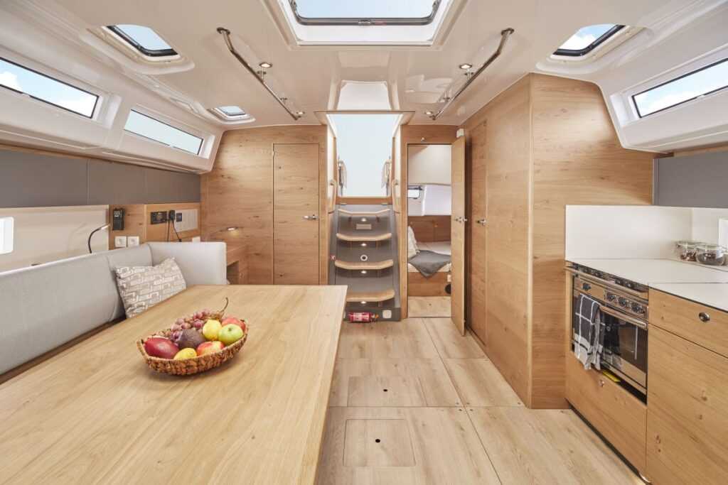 A belső tér tölgy bútorlapjai stílusos kontrasztban állnak a szürke tárolószekrényekkel. Figyelmes plusz, hogy a nagyobb igénybevételnek kitett felületek tömör tölgy borítást kapnak a tartósság érdekében. Elődeihez képest az Elan I43 szélesebb, így sokkal több helyet kínál, pláne, hogy a mára szinte védjeggyé vált emelt kajüttető továbbra is megvan, feladva a leckét a konkurenciának.