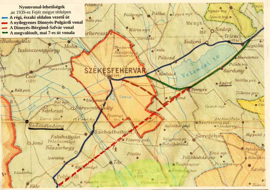 Volt azonban egy, az autós társadalom által erősen pártolt, propagált terv, ami szerint Dinnyést elhagyva nem Fehérvárra, a Budai útra torkollott volna be az új országút, hanem a várost elkerülve, Börgöndöt és Tácot érintve Polgárdi után érte volna el ismét a 7-es utat. Ez a Sukorón és Fehérváron keresztül vezetett régi úthoz képest kb. 30 km-rel és több mint fél órával rövidítette volna meg az autósok Budapestről Siófokra vezető útját! A terv ellen Székesfehérvár tiltakozott a legerősebben, mert a város az áthaladó autóktól kövezethasználat címén alkalmanként 2 pengőt szedett be, évi sok tízezer pengő értékben. A fehérváriak felháborodását jól tükrözi, hogy a Székesfehérvári Friss Újság Vakmerő terv, illetve Őrült terv szalagcímmel adott hírt a koronázó város „tönkretételével” fenyegető elképzelésről. Ezt az útrövidítő tervet gyakorlatilag az utolsó pillanatig lebegtette az építkezést megrendelő miniszter, aki még 1934-ben is úgy nyilatkozott, hogy a déli parti út megépítését akkor tudják elkezdeni, ha ahhoz Fejér vármegye és Székesfehérvár „hatszámjegyű” összeggel járul hozzá. 1934 őszén megszületett a döntés: a vármegye és Fehérvár kétszázezerkétszázezer pengővel támogatta az építkezést – ne legyen azonban kétségünk: ennek ára az út Fehérvárt elkerülő vonalának elvetése volt. (Eljátszhatunk a gondolattal: vajon ha ez a DinnyésTác–Polgárdi vonal valósul meg, akkor harminc évvel később talán az M7-est sem az északi parton, hanem délen, Hajdútanya–Csiribpuszta–Elzama jorBörgönd magasságában valósítják meg – mint ahogy volt is ilyen alternatív nyomvonal-elképzelés). Amikor azután a megye és a város vállalta a hozzájárulás meg zetését, és eldőlt, hogy Fehérvárt mindenképpen érinti a balatoni országút, még mindig volt alternatíva. Komoly esély látszott ugyanis arra, hogy Dinnyésről a Fertő átszelésével, Börgönd érintésével a 62-es útra térve a Seregélyesi úton érjék el az autósok Székesfehérvárt. Ez még 1934 nyarán, a miniszteri szemle során sem dőlt el. Végül azonban a megtervezéskor-kitűzéskor Dinynyéstől mégis a jelenlegi, 4-5 km-es, vizenyős területen való átvezetéssel a Budai útra való bekötést választották. A Vállalkozók Lapja szerint az út építésekor ezen a területen csak teljes talajcserével lehetett elérni a megfelelő alapozást. Ezt is, mint a teljes Kápolnásnyék–Székesfehérvár szakaszt Schneller Lajos kir. főmérnök tervezte és a kivitelezés irányításában is részt vett. A kisebb patakhidakat és a dinynyési vasúti felüljárót is beleszámítva az új út költségei elérték a kétmillió pengőt.