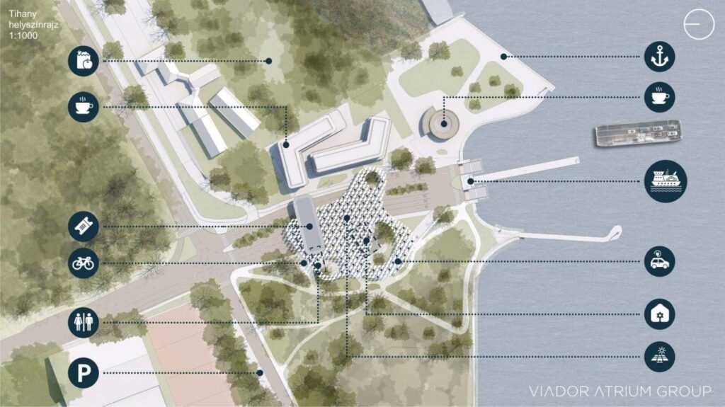 A következőkben a Viador Átrium Group mutat egy lehetőséget az átalakulásra. A területet bejárva és a meglévő használatot feltérképezve az az előzetes koncepciójuk alakult ki, hogy nem szükséges a meglévő épületállományt tovább duzzasztani, viszont nélkülözhetetlen a meglévőre rakódott sallangok letisztítása. Meggyőződésük, hogy az itteni építményeknek a két part kapcsolatát ugyanúgy kell szolgálnia, mint megteremteni a tihanyi és szántódi területek önálló működését.