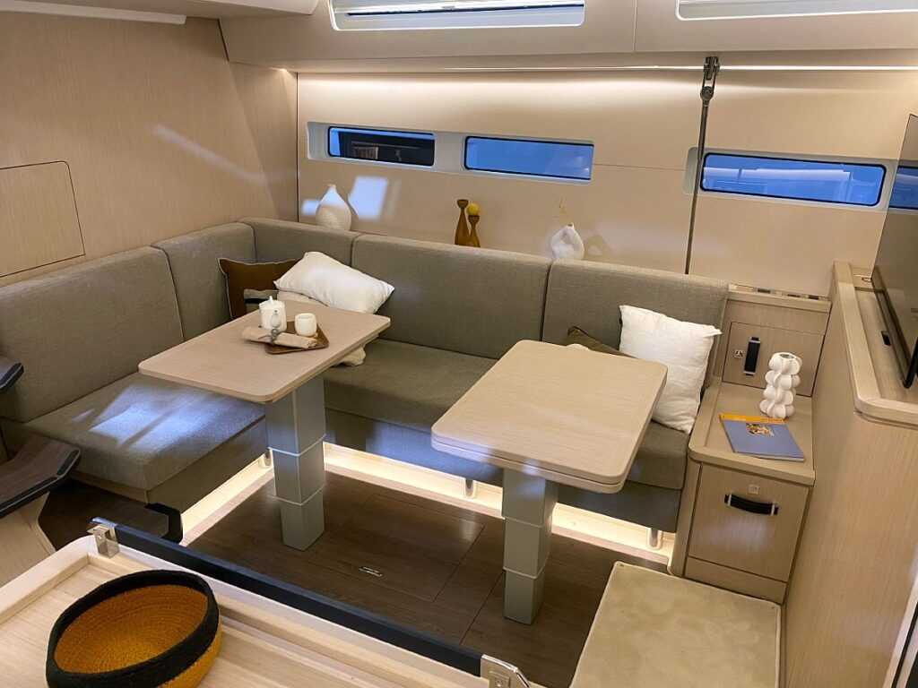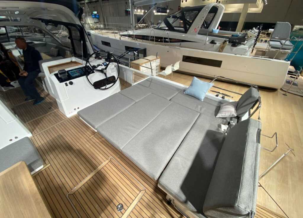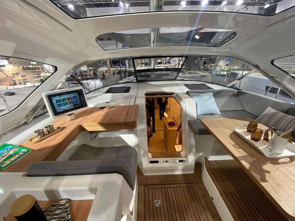A süllyesztett („akadálymentes”) kokpitot két különálló térre osztották, közülük az első zárttá tehető. Hátul – kihasználva a hajó teljes szélességét – két asztalt körbeülve rengeteg vendéget tudunk leültetni, vagy privát használat esetén hatalmas napozóteraszt alakíthatunk ki. A két kormányállást előrébb hozták, így könnyedén tudjuk irányítani a hajót. A Jeanneau-nál már bevált módon süllyesztett oldalfedélzeten keresztül lehet megközelíteni a hajó elejét. Előrehaladva jobboldalt egy étkezőrészt találunk, míg balra egy dolgozónak is használható rész kapott helyet, amely térképasztalként szintén működik. Három kabinlejárója közül kettő privát hozzáférést biztosít a vendégkabinokhoz.