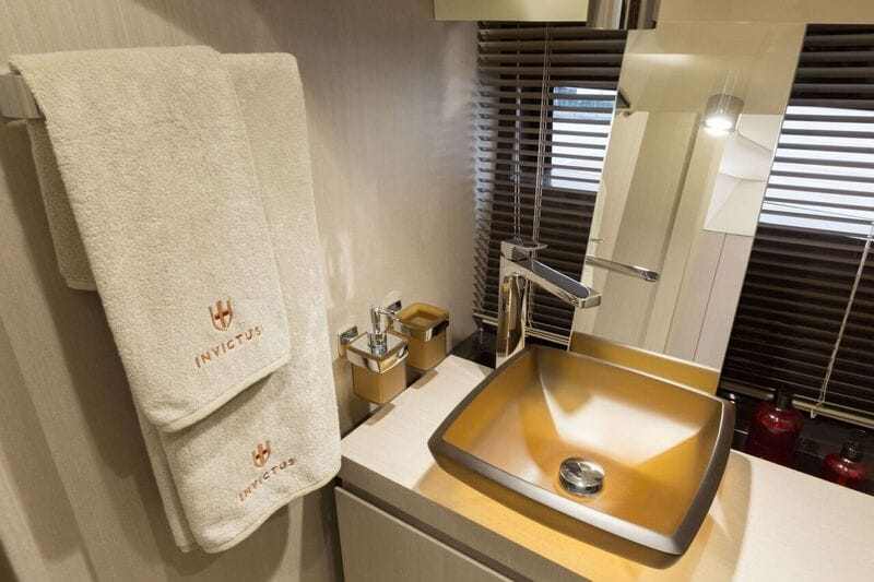 A hajót karakteres, ragyogó külső, minőségi anyagok jellemzik, berendezésében és kárpitozásában is világszínvonalú. A legújabb és legdivatosabb anyagok felhasználásával készült. Különleges minőségi bőrök és krómozott, rozsdamentes acélfelületek ékesítik, amelyek nem csupán kiemelik az Invictus örökséget, de értéket is adnak hozzá, valamint növelik az életterek esztétikai szépségét és hasznosságát.