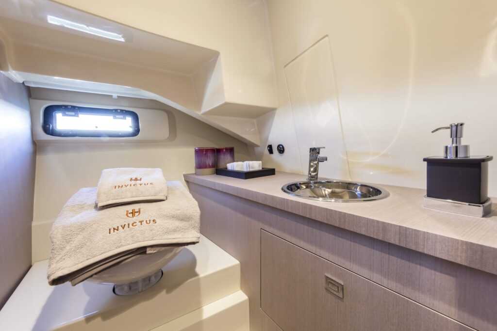 A kormányállás melletti lépcső vezet le a kabinba. A szalon kanapéja könnyedén ággyá alakítható, a hűtőszekrény bőven elegendő akár egy pár napos készlet tárolására is. A fürdőszoba meglepően tágas és kényelmes.