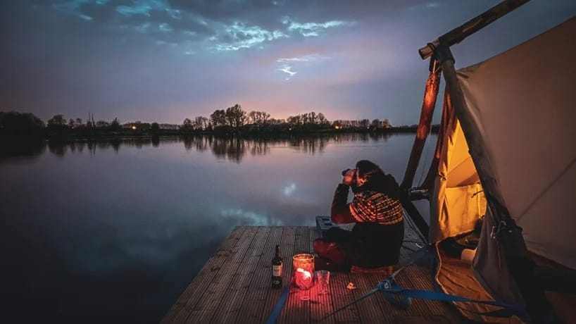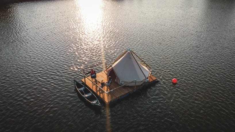 A belga Tobias Knockaert és Kika Merlin tavalyi, fákra épített házakból épített hotelje után mos itt az újabb alternatív szálláshely, az úszó kemping. Rendesen, felállított sátrakkal, ahogy kell.