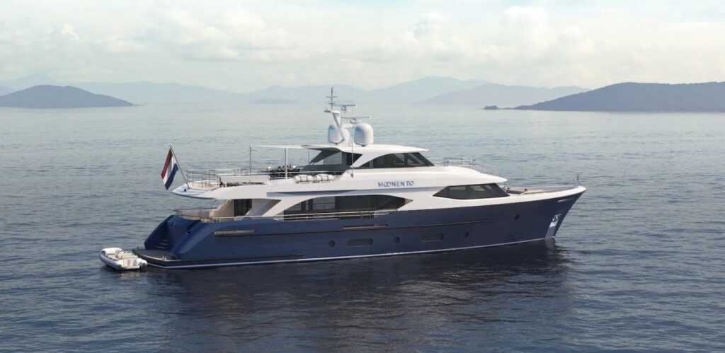 Vérbeli úriembernek való jacht a holland hajógyártól. A Den Bosch-ban testet öltő Moonen 110 a Moonen 84 és 97 modellek formatervezési jegyeit veszi át, külsejét René van der Velden, szerkezetét a Diana Yacht Design, belterét a londoni székhelyű Studio Indigo tervezi. Utóbbi középpontjában egy természetes faanyagból készült, bordázott csigalépcső áll.