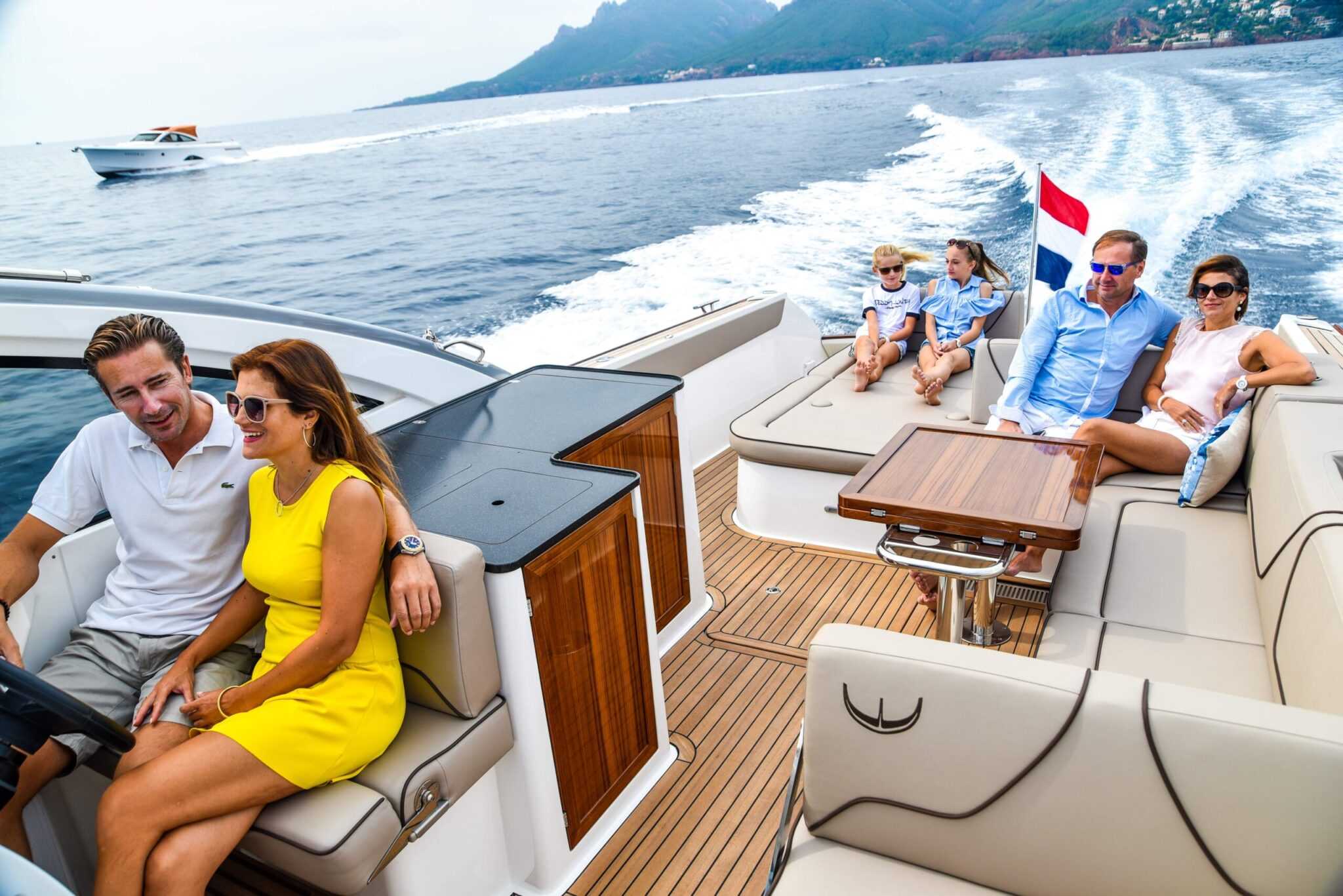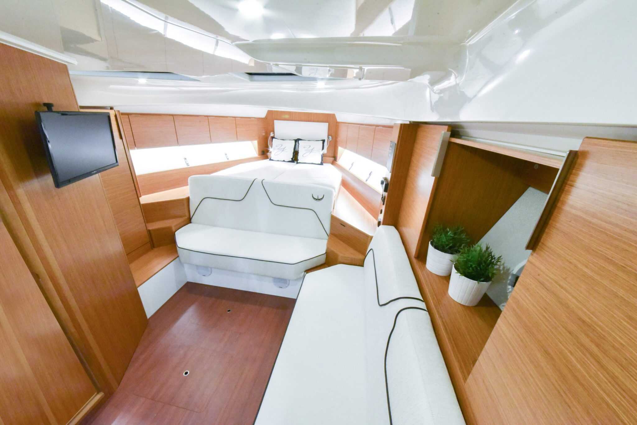 Egy 42 lábas nyitott hajó csinos vonalakkal: ezt láttam. Kifutottunk a tengerre, és beszippantott a csoda. Mert halk volt a járása (már amennyire két 400 lóerős Volvo motor halk lehet), és olyan játszi könnyedséggel jött siklásba, hogy tényleg észre sem vettem. Nem emelte meg az orrát, nem húzta a vizet, csak egyszerűen felúszott. Kiértünk a nyílt tengerre, ahol már nagyobbak voltak a hullámok, de ez alig hozott változást a hajó mozgásában: mint svájci bicska a holland vajat, úgy vágta a francia hullámokat. Siep rámutatott a műszerfalon egy digitális számjegyre: a pillanatnyi fogyasztás volt az. Megdörzsöltem a szemem, hogy biztosan jól látok-e. Ez a hajó minden tekintetben toronymagasan felülmúlta a korábbi tapasztalataimon alapuló várakozásaimat. Csoda – minden dimenzióban. Ezek után kicsit más szemmel néztem körbe a hajóban, hogy felmérjem, mennyire élhető. Semmi drámai fordulat, mert bent is szuper.
