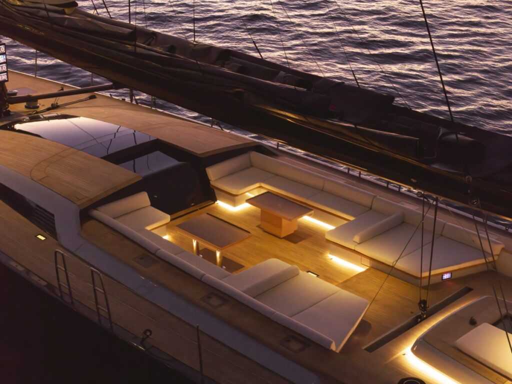 Kiemelendő megoldás a hajó hátsó nyitható tatja, amely egyszerre rejt egy ötméteres dingi számára kialakított garázst és alakítható át strandklubként szolgáló napozó- és fürdőterületté. A dekk borítása fenntartható erdőkből származó természetes fa, tükrözve a tulajdonos környezettudatos szemléletét.