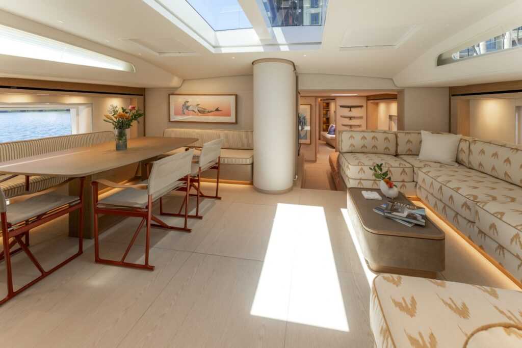 A belső tér kialakítása a modern, tenger ihlette eleganciát ötvözi otthonos melegséggel. A tulajdonos egy világos, nyitott atmoszférát kért, amit a Nauta Design természetes anyagokkal és letisztult formákkal valósított meg. Az enteriőr domináns anyaga a világos tölgy, amit sötétebb diófarészletek ellenpontoznak – ezek a kontrasztok megtalálhatók az étkezőasztalon, a szalonban és a kabinokban.