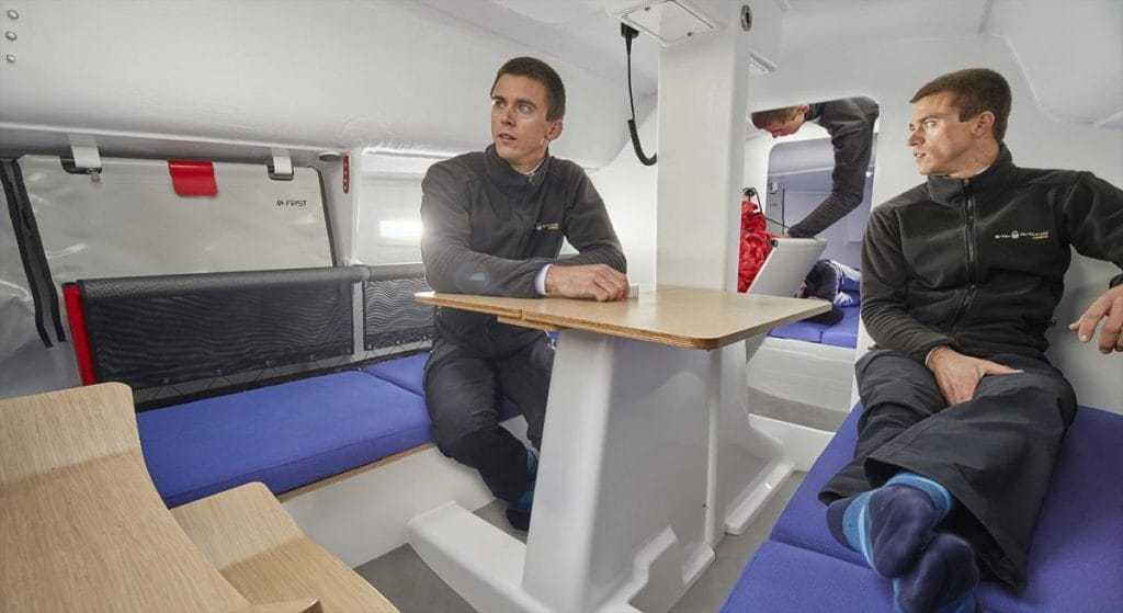 A First 27 SE belseje első pillantásra igencsak minimalistának tűnik, de a visszafogottság egyrészt a súlycsökkentést szolgálja, másrészt a berendezés elemei a struktúra alapvető elemei. Az orrkabinban két, a szalonban további négy felnőtt alhat, a mágneses ajtók által pedig az árbóc előtti szekció az aktuális igények szerint alakítható: WC, kabinhosszabbítás, vizesruha-tároló. Szintén a beltérben található jó néhány tárolórekesz a legénység személyes holmijának, hűtőrekesz, asztal lehajtható lapokkal és vitorlatároló.