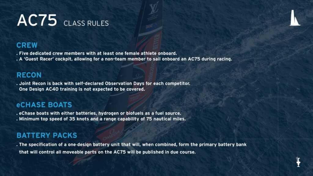 Minden AC75-ös hajónak öt legénységi tagja lesz, legalább egy női vitorlázónak kötelező a fedélzeten lennie a legénység részeként. A „Vendégversenyző” pozíció lehetővé teszi, hogy egy nem csapattag is az AC75 fedélzetén vitorlázhasson a verseny alatt.