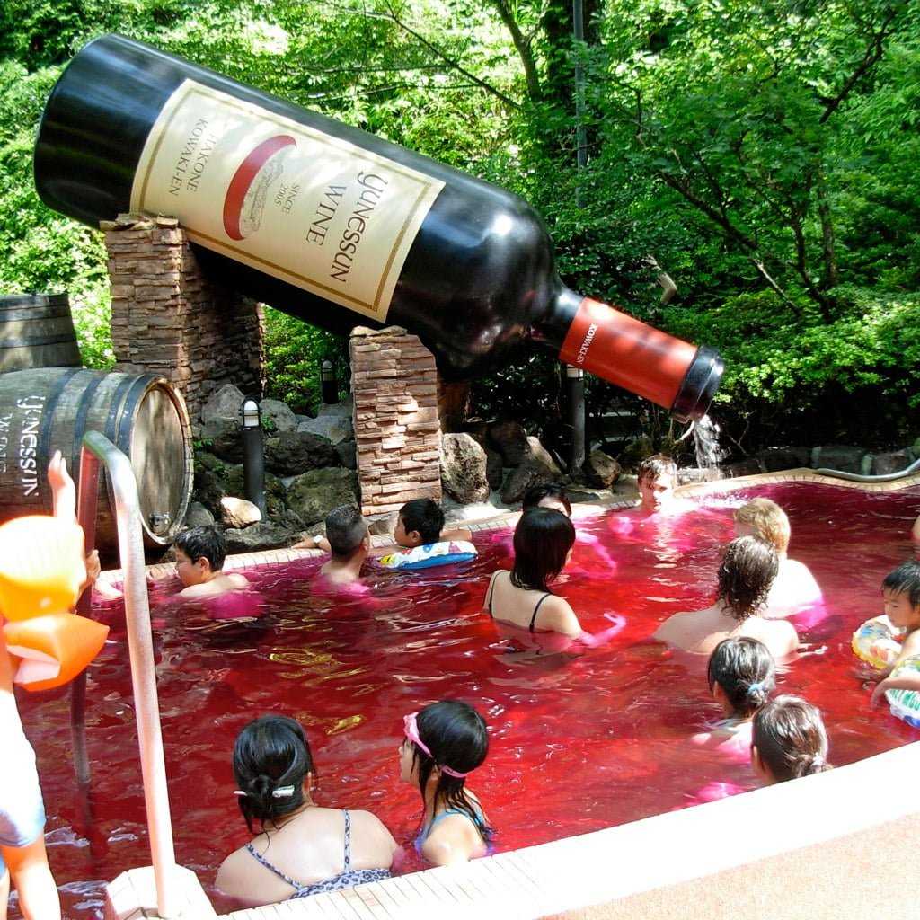 A Tokióhoz közeli Hakone Kowakien Yunessun fürdőkomplexum egy kicsit csavart a forrásvizek tartalmán, hogy még hívogatóbbá és egyedivé tegye a szolgáltatásait. A létesítményben különböző „tematikus medencék” találhatók, úszkálhatunk egy sötét barlangban, ahol csak a világító halak foszforeszkálnak, de megmártózhatunk zöld teában, kávéban, vörösborban és tésztalevesben is.
