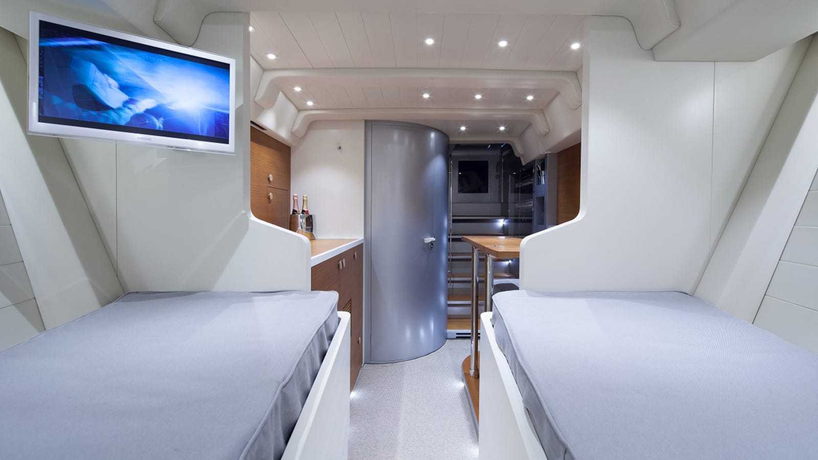 Szerény de luxus igényességgel kialakított belső terei épp csak arra teszik alkalmassá, hogy egy kétszemélyes dayboat minden attribútumával szolgálni tudjon. A kétszemélyes fekhely mellett található konyharészben minden megtalálható, ami egy délutáni frissítőhoz kell.
