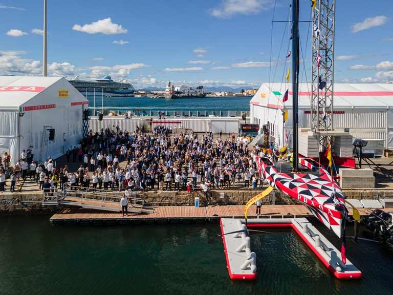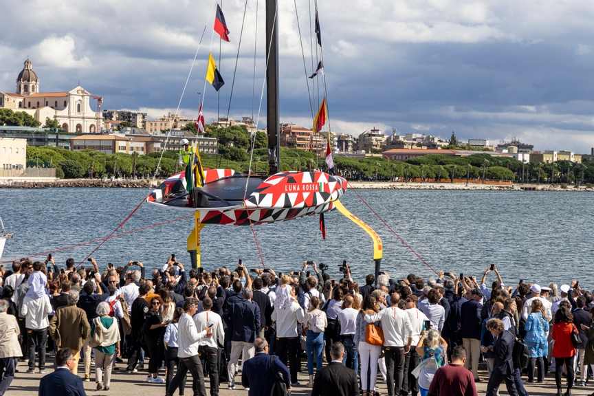 Cagliariban megkeresztelték és vízre tették a 37. America’s Cupra készülő csapat hajóját, amely prototípusa következő AC75-ösüknek.
