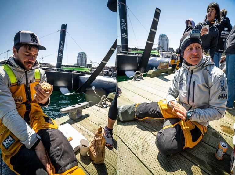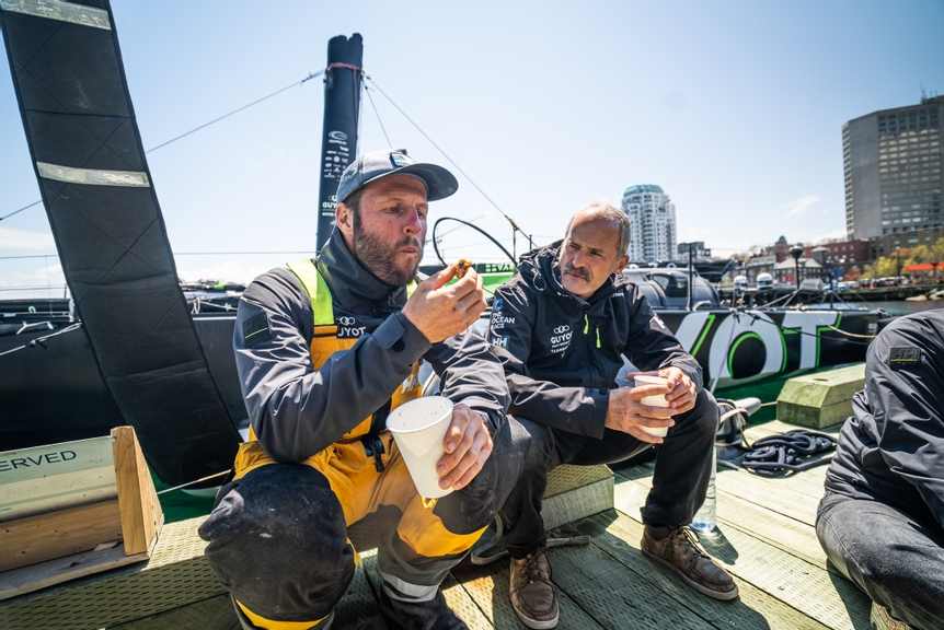 Megérkezésünkkor nem ünnepeltünk, hanem egymás karjaiba borultunk a megkönnyebbüléstől. Május 13-án, szombaton, helyi idő szerint 12.30-kor a Guyot environnement – Team Europe – négy és fél nappal az Atlanti-óceán északi részén történt baleset után – elérte a kanadai Halifaxot. A parti csapat pizzával és süteménnyel várta a legénységet (Benjamin Dutreux, Robert Stanjek, Annie Lush, Sébastien Simon és Gauthier Lebec fedélzeti riporter).