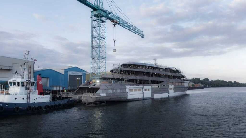 A 130 méternél is hosszabb Lürssen szuperjacht, a Project Deep Blue „kijött a fényre”, még jóval a vízre tétel előtt.