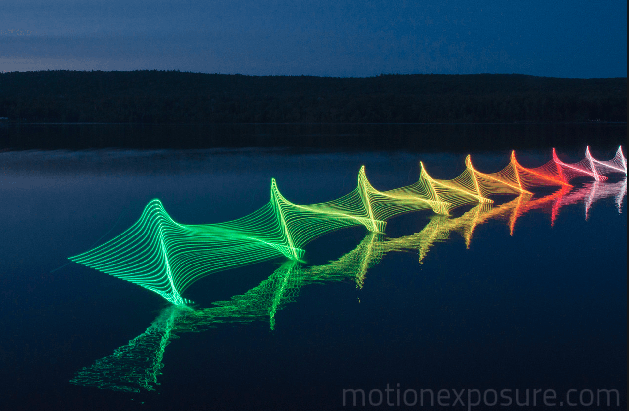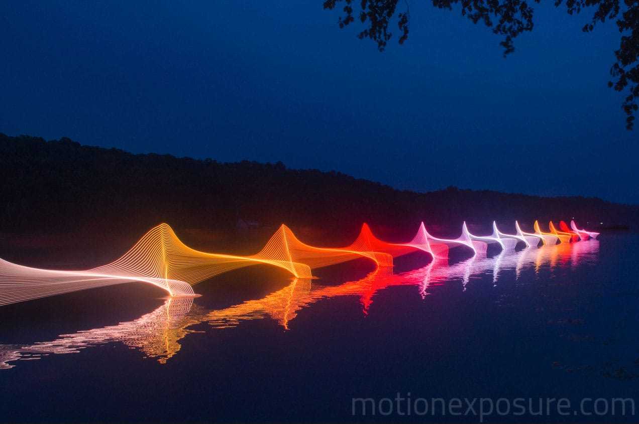 A fotós a kajakok és kenuk evezőire színes LED-eket rögzített, így a hosszú záridővel készülő képeken az evezős csapásaiból gyönyörű minták alakulnak ki.