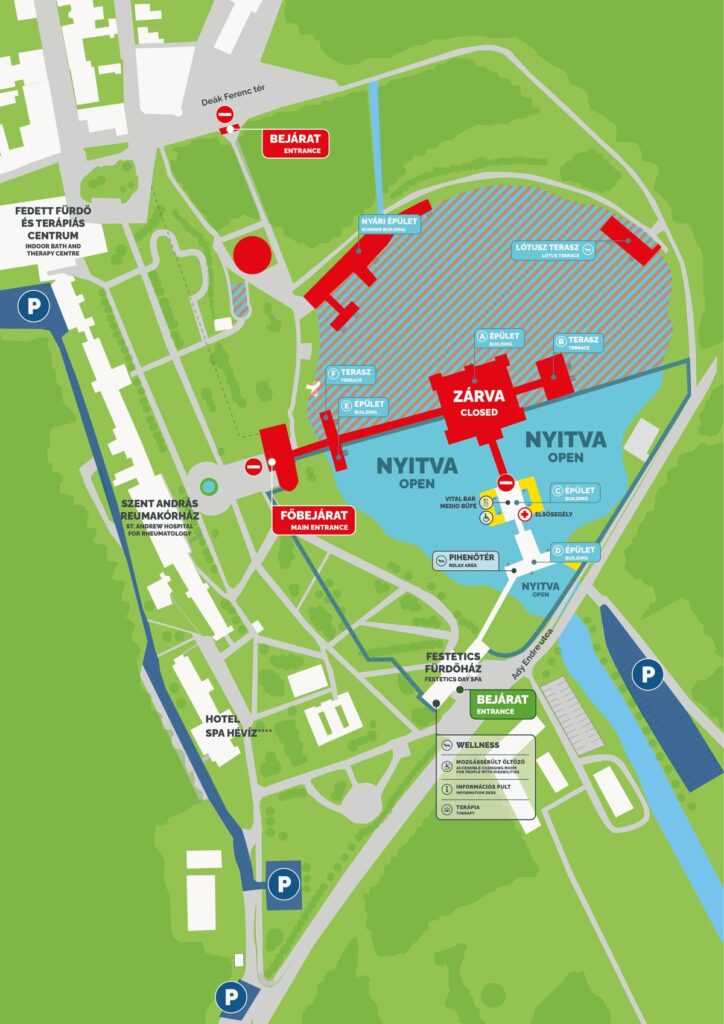 A Festetics Fürdőház, a wellness és a terápiás részleg, a Kinesio-lab, a Vitál Bár és Medio Büfé és a köztük lévő fedett pihenőterek a Festetics-fürdőház és Vitál Bár/Medio Büfé közötti szakaszon – a C és D épület között –, valamint a főbejárat és Festetics-fürdőház közötti szabadtéri partszakasz látogatható, de ez utóbbi időszakosan. A lezárások miatt létszámkorlátot vezetnek be a Tófürdőben.