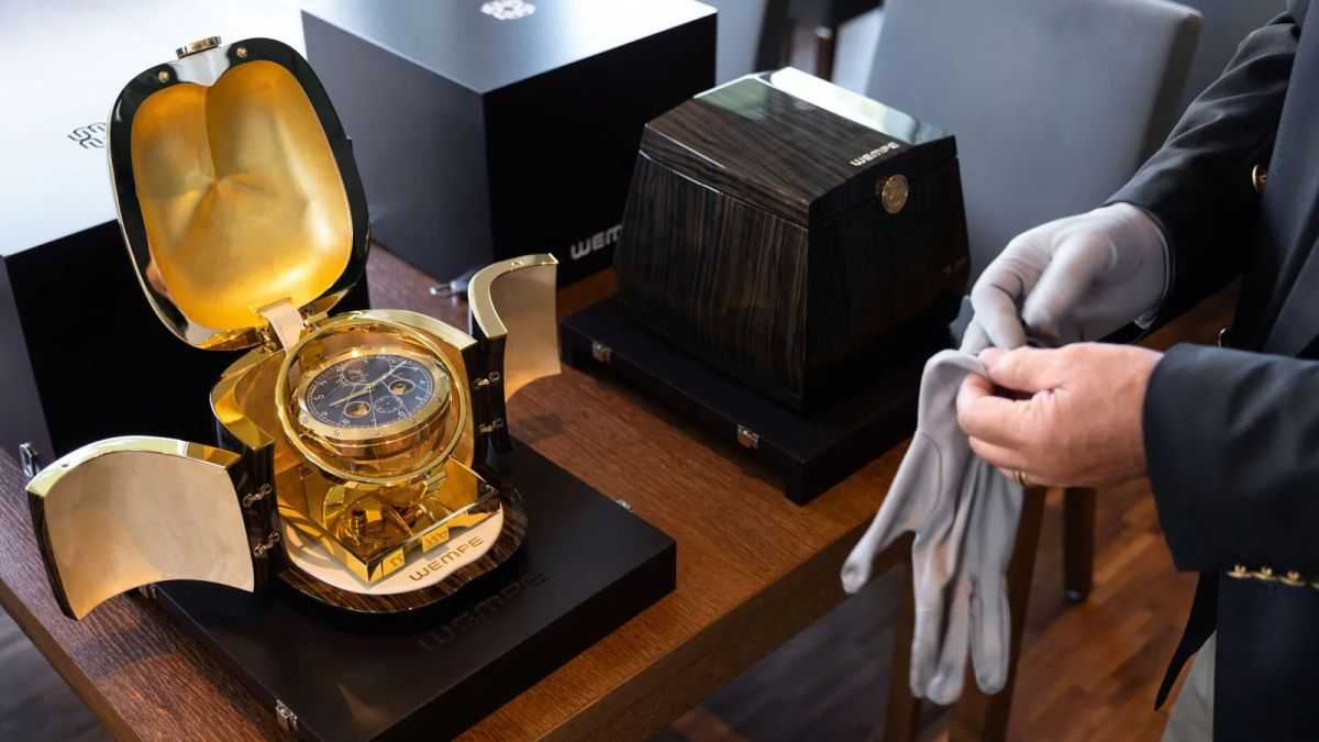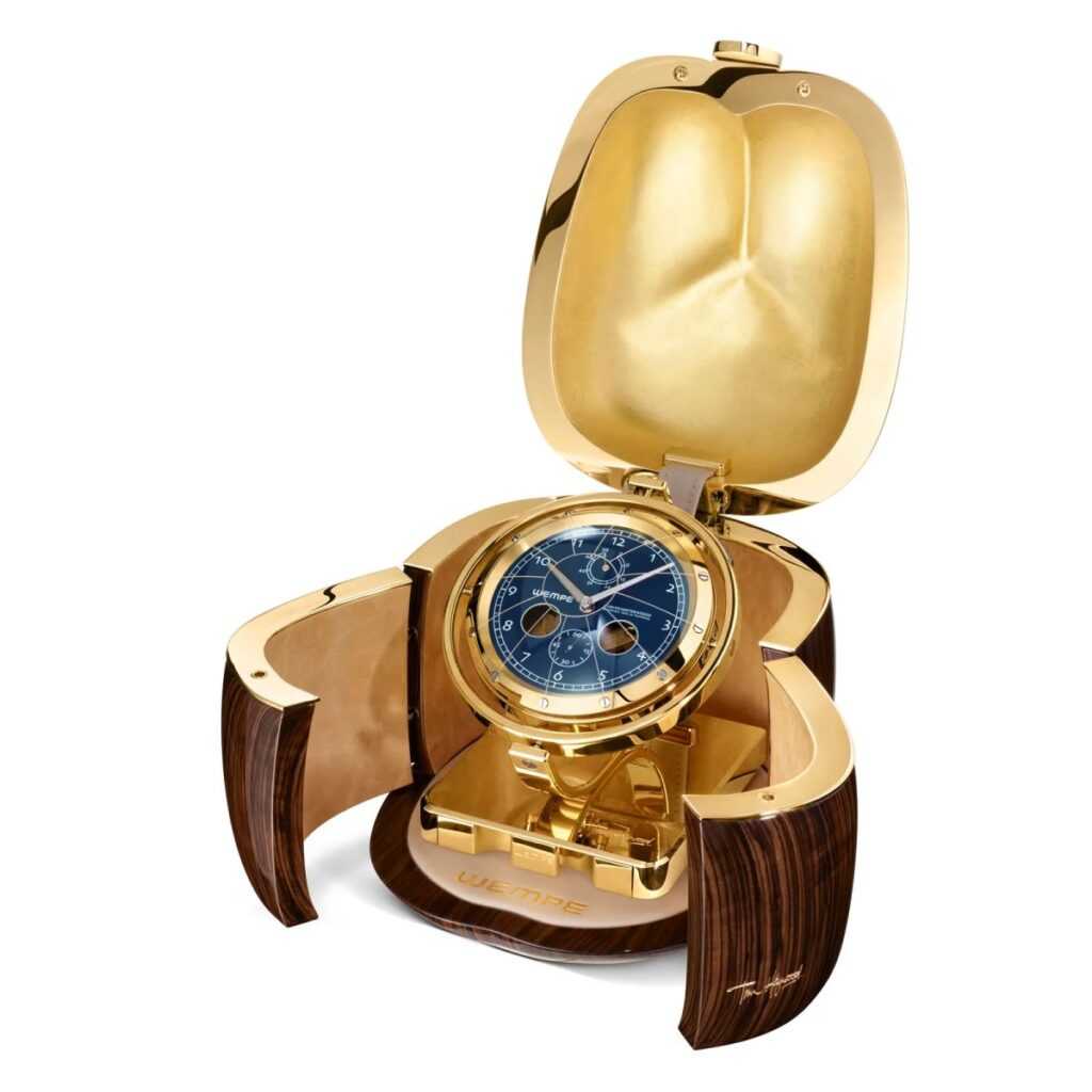 A Wempe Marine Chronometer Cube sötétbarna, kézzel polírozott, 16 réteg lakkozott finomfa tokja egy aranyozott sárgaréz órát tár fel a háromfelé nyíló ajtók mögött. Az ellenálló üvegház alatt a számlap mélytengeri kék színben ragyog. Napi 0,3 másodperces maximális járáseltéréssel és 56 órás járástartalékkal ezek az órák a legmagasabb fokú pontosságot képviselik.