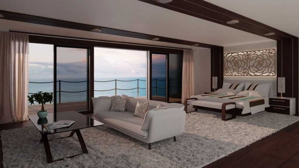 Figyelemre méltó részletek: a kialakítás többszintes „beach club”-ot foglal magában, átalakítható úszóplatformmal. A főfedélzeti üveg átrium bemutatóteremként vagy műteremként használható, és egy csigalépcső veszi körül, amely lehetővé teszi a vendégek számára, hogy betekinthessenek a szerkezet belsejébe, kifelé fordulva pedig a tengert lássák. A napozóterasz rengeteg helyet kínál a pihenéshez, míg az alsó fedélzeten található vendégkabinok közvetlen hozzáférést biztosítanak a wellnessrészleghez.