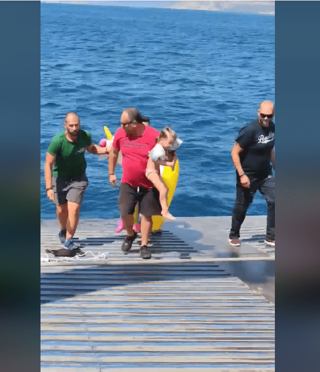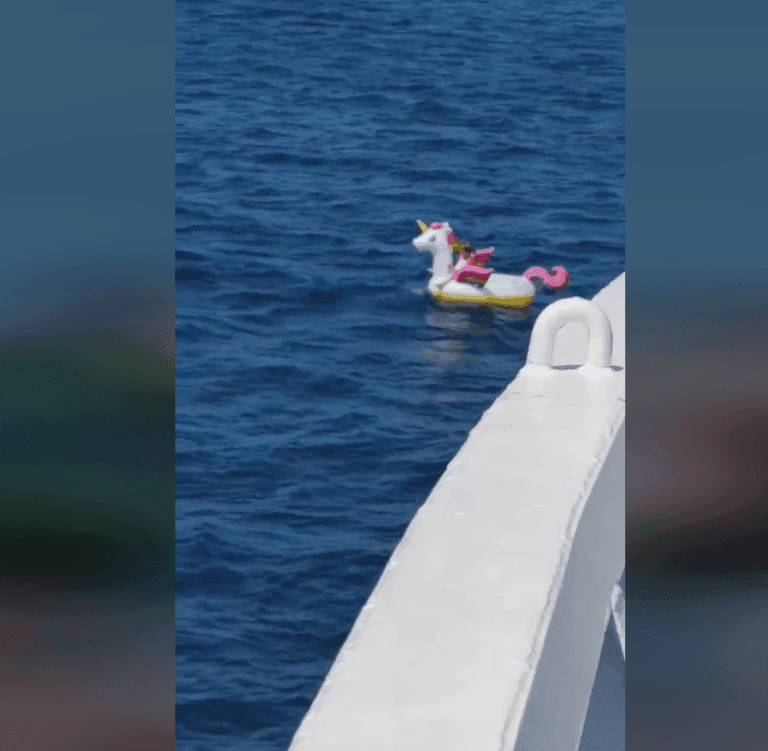 A négy év körüli kislányt egy komp mentette ki, miután az óriási felfújható egyszarvúval kisodródott a nyílt tengerre. Már körülbelül fél mérföldnyire volt a parttól, amikor felfedezték.