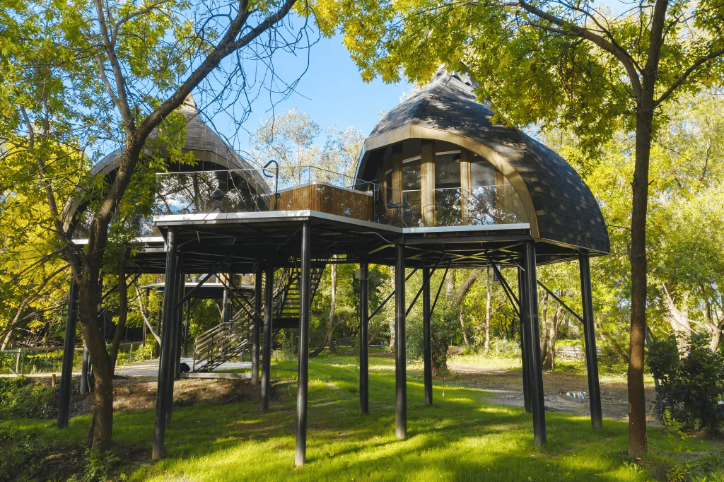 Ezek a hagyományőrző megjelenésű építmények igazi kuriózumok, hiszen hagymakupolás, organikus építészeti stílusú lombház az egész világon nincs.