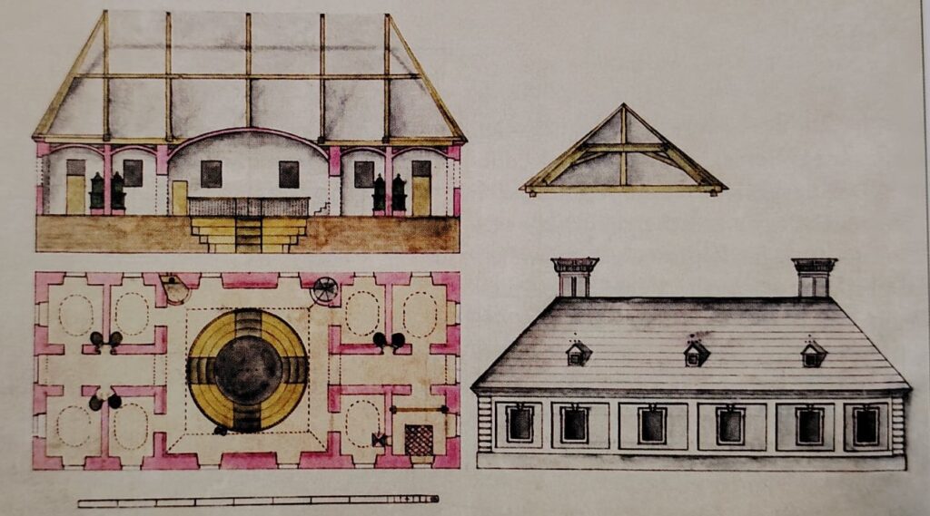 Rantz János fürdőház terve 1795-ből, keresztmetszet, alaprajz és homlokzat: