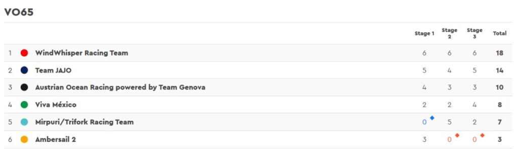 A szakaszt nyerő WindWhisper Racing Team bő 24 órát vert a másodikra, már hétfőn befutott, de aztán sűrűvé vált a program: kedd délelőtt megérkezett a Team Jajo (érdekesség, hogy még a Malizia előtt), majd sorban a többiek: Viva México, Austrian Ocean Racing powered by Genova, Mirpuri/Trifork Racing Team (az Ambersail 2 nem indult). Itt nincs vita, a WindWhisper magabiztosan nyerte a VO65 Sprint regattát.