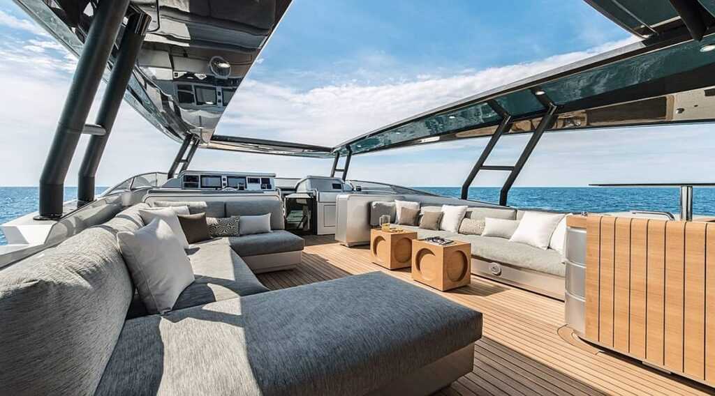Komoly előnye a flybridge-nek a szalonéhoz hasonló sík alap, szabad kezet adva az elrendezéshez, miközben az egész tér fölé védőernyőként borul a merev tető és az elektromosan mozgatható árnyékoló. Kerülhet ide napozóágy, kanapé, grillsütővel kiegészített konyha, jakuzzi vagy ami épp a megrendelő eszébe jut. Hogy fér el ott mindez? Az MCY 105-ös flybridge-ének az anyaga karbon, így kialakítható a méretkategória legnagyobb „terasza”, aminek csekély össztömege a hajó stabilitását sem rontja. Az orrban gigantikus közösségi teret alakítottak ki, ahol a kültéri mozi is helyet kaphat. Átellenben, a tatnál a hidraulikusan mozgatható fürdőplatformból sima terasz helyett lehet akár igazi „beach club” (napernyőkkel és megnövelt felülettel).
