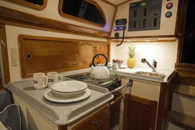 A kényelmes és tágas, 185 centiméteres belmagasságú belső tér klasszikus Herreshoff stílusban készült antik válaszfalakkal és fényes lakkozású, tömör mahagóni fabútorokkal. A hajókonyha billenő tűzhellyel, DC hűtőszekrénnyel, Corian mosdópulttal, fényezett mosogatókagylóval és hideg-meleg túlnyomásos víztartállyal van szerelve. Az orrkabinban Vacuflush WC, Corian mosdópult fényezett Corian mosdókagylóval, hideg-meleg víz, és zárt zuhanyfülke található falra szerelt, hőszabályozós zuhannyal és szellőzőnyílással a tetőn. A szalonban a bal és jobboldali kanapékat a kényelmes pihenés vagy alvás jegyében tervezték. A lehajtható szélű mahagóni asztal első osztályú mestermunka, és kellemes étkezésekre invitál. Az étkezőasztal feletti „Butterfly” Skylight típusú kabintetők és a nyolc fix kabinablak sok természetes fényt engednek be, és remek szellőzést biztosítanak. A kanapék elülső felénél két oldalon asztalok találhatóak alattuk tárolókkal, felettük pedig falra szerelt szekrényekkel. Továbbá négy sarok szekrény található a kanapék végében. Az elülső kabin hatalmas fekhellyel, teljes hosszában polcokkal, és illeszkedő ruhásfiókokkal rendelkezik. Egy hatalmas kabintető és két 4” SS Dorade szellőző biztosítja a fényt és a szellőzést.