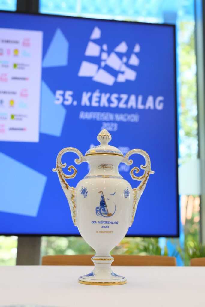 „A Herendi Porcelánmanufaktúra hosszú évek óta együttműködő partnere a Kékszalag vitorlásversenynek. Idei évben is egy új kreatív mintával készültünk, utalva Herend innovatív gondolkodására. Az idei díjon az elvékonyodó kék szalag, mint a Balaton vizének szinonimája jelenik meg a motívumban, és ennek a hullámként funkcionáló kék szalagnak a szárnyán található a klasszikus, kék Apponyi mintával dekorált vitorlás hajó, amint az élre tör. A háttérben szálló madarak sziluettje még inkább kiemeli a nagy vízfelület jelenlétét. A 24 karátos matt arannyal történő festés tovább nemesíti a trófeát – mondta el még korábban Dr. Simon Attila a Herendi Porcelánmanufaktúra Zrt. vezérigazgatója.