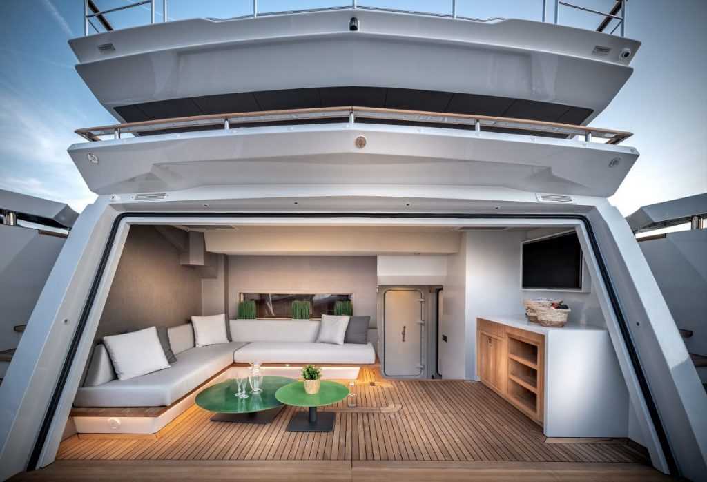 A hátsó fedélzeten egy fürdőplatform és egy belső társalgó található, amely szó szerint a víz szintjére került. A tágas külső terek nyújtotta kényelem az új modell egyik különlegessége.
