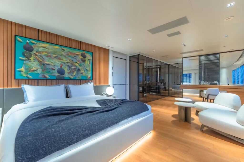 A hűvös és minimalista belső tér semleges színvilágával nyitottságot sugároz, miközben pihentető hangulatot teremt. Két szalonja és négy lakosztálya akár nyolc szerencsés chartervendég maximális kényelemben való szórakoztatását és elszállásolását teszik lehetővé. A külső fedélzet gyönyörű berendezései minden pillanatot emlékezetessé és rendkívül kényelmessé tesznek, a hidraulikus úszóplatform pedig olyan vízparti menedék, ahonnan a vendégek közvetlenül a hűvös óceánba merülhetnek.