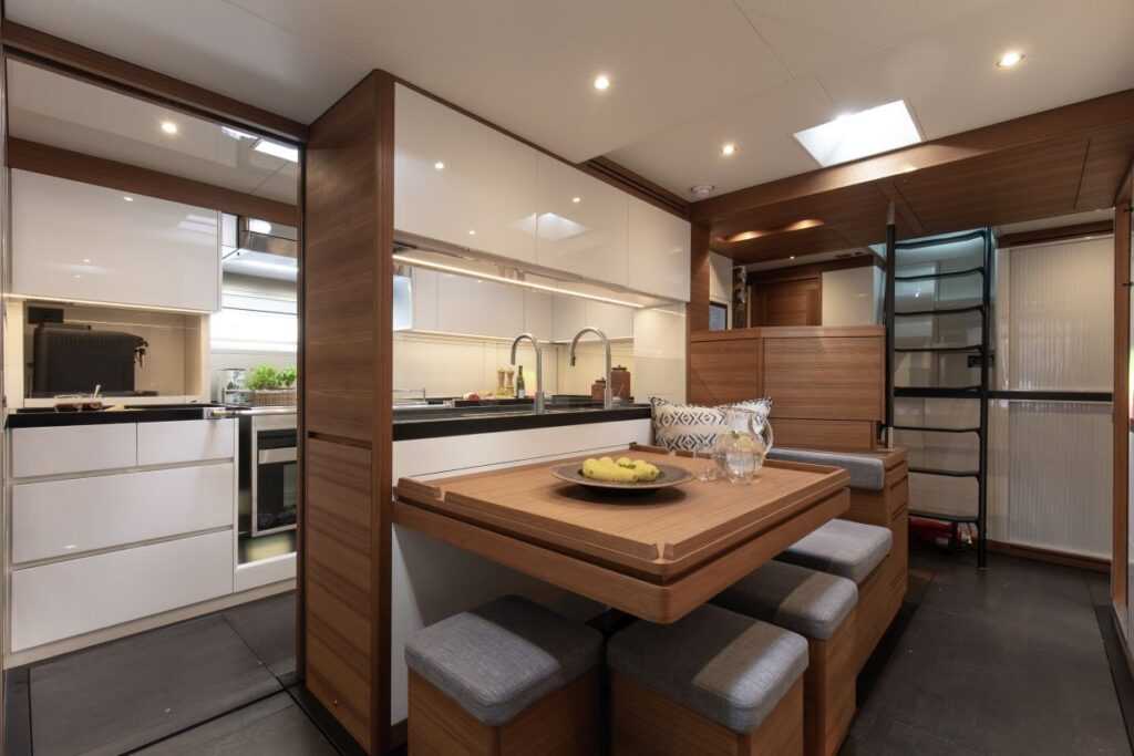 A szinte a tatig hátrafutó széles kávák a fedélzettel egy egységet képezve esztétikus teakborítást kaptak. Ezek amellett, hogy kényelmes ülőhelyet biztosítanak manőverezés közben, helyet adnak oldalanként 3-3 csörlőnek is. A kompakt, de komfortos kialakítás és a kormányállások gyors elérése kimagasló vitorlásélményt nyújt kis létszámú legénység mellett is. A látványt és a hangulatot fokozzák a faborítás pereme alatt elhelyezett LED-sorok, amelyek sötétben egy lebegő platform hatását kölcsönzik. A fedélzet a biztonságos közlekedés és üzemeltetés miatt sima és tagolatlan, egyedül egy lépcsőfok töri meg, ami az utaskokpitba vezet.