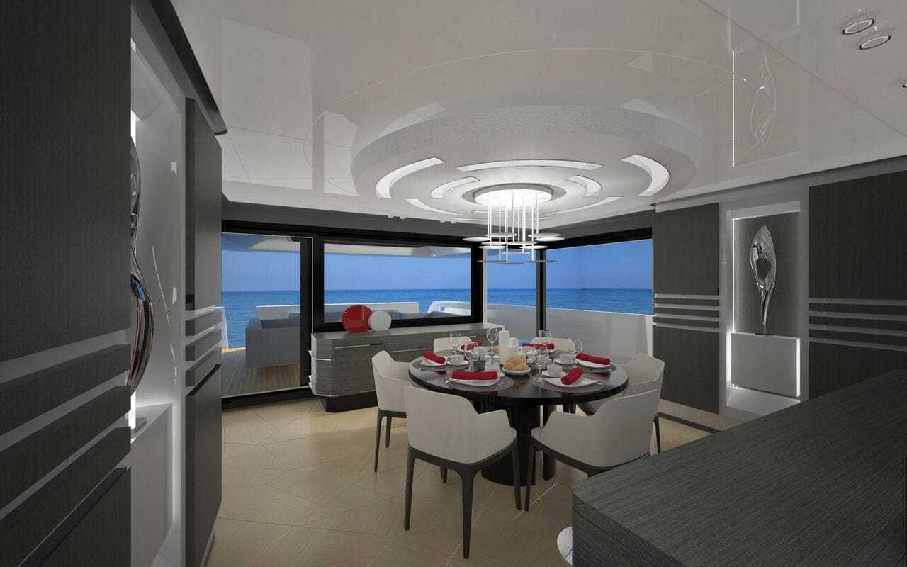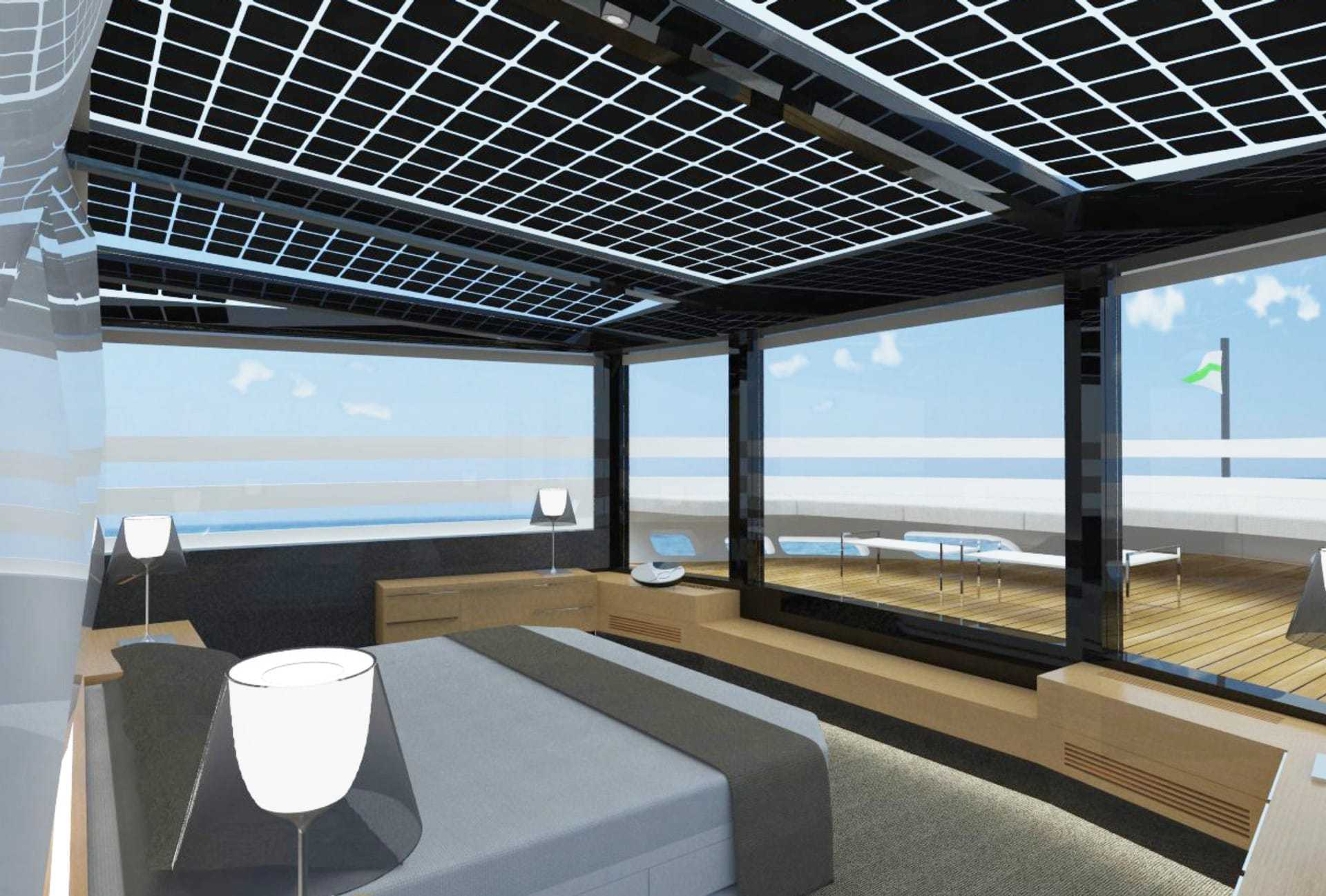 A fedélzeten öt kabin található, a tulajdonosi kabin közvetlenül a privát napozóra nyílik. Mosókonyha, öltöző, fürdő is tartozik a tágas, jól megvilágított lakosztályhoz. Az enteriőrt a vörös és a szürke színek uralják, melynek ötlete és tervezése Alex Turco olasz művész nevéhez fűződik.