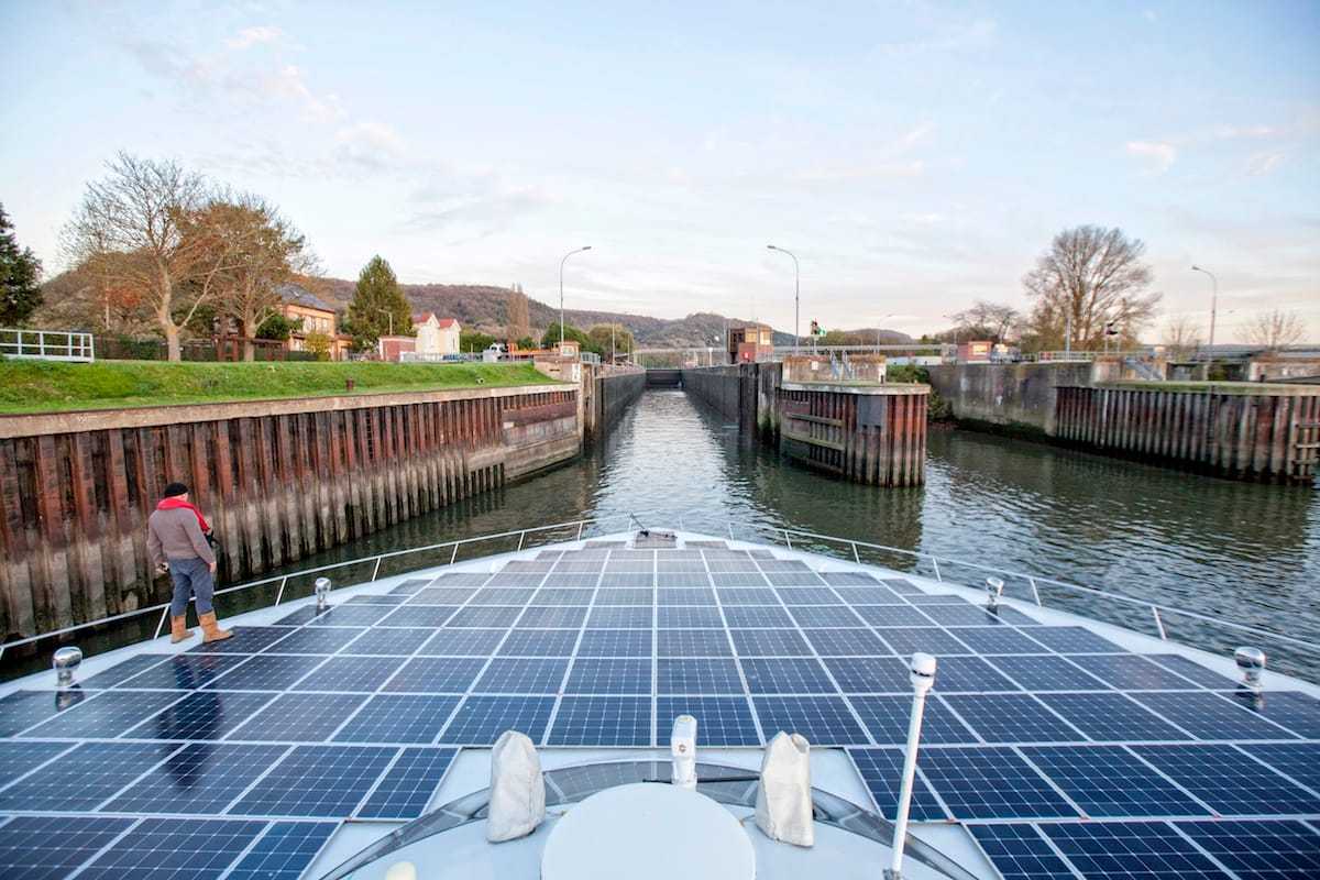 Trip on the Seine river with the Planet Solar yacht between Rouen and the D'Amfreville lock. The MS Tûranor PlanetSolar is currently the largest solar boat ever built, Planet Solar was launched on March 31, 2010 after 3 years of feasibility studies, construction, tests, and optimizations. On May 4, 2012, after 585 days of navigation, the MS Tûranor PlanetSolar reached Monaco, the starting point of the trip around the world, powered 100% by photovoltaic energy.
