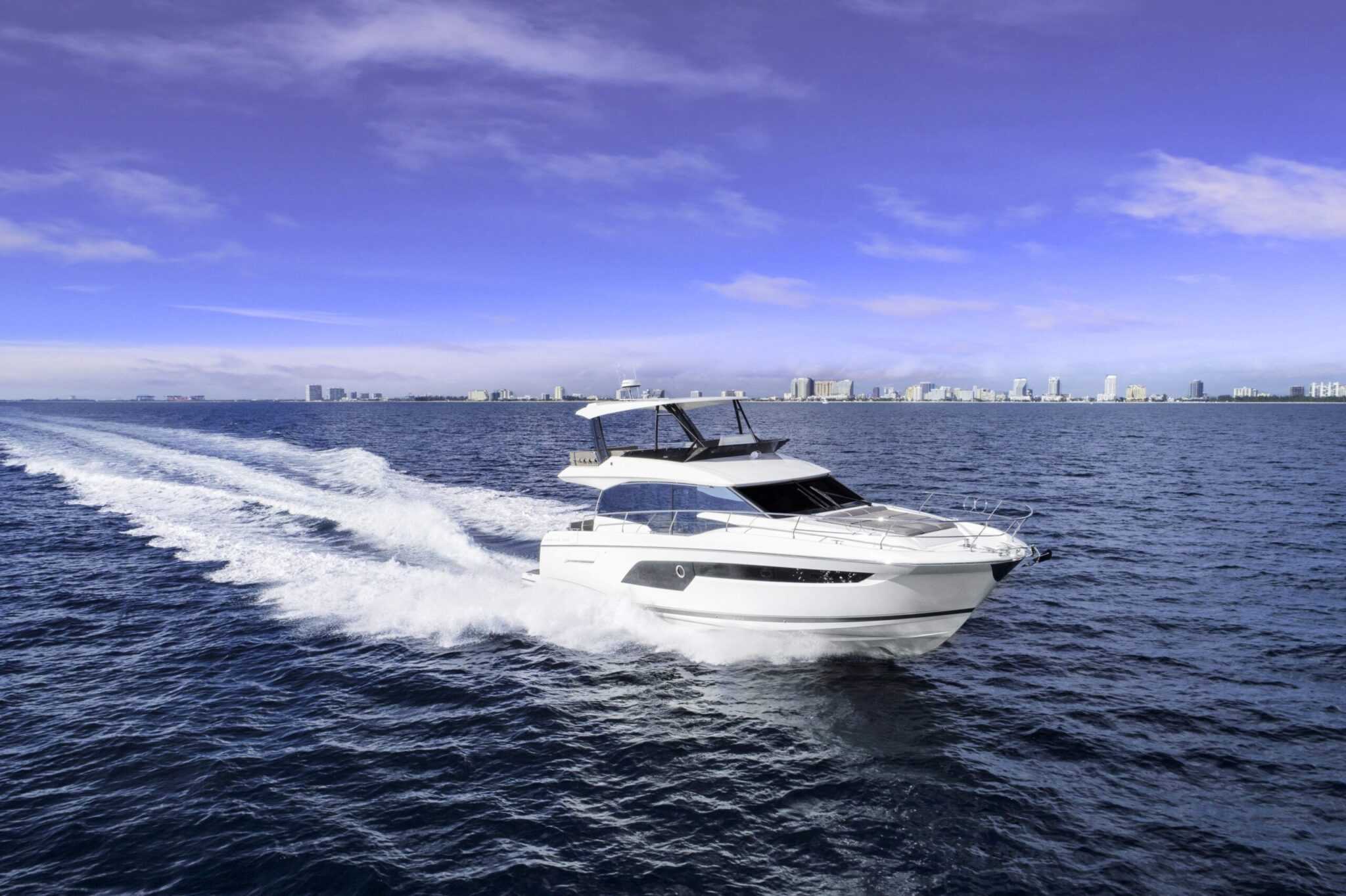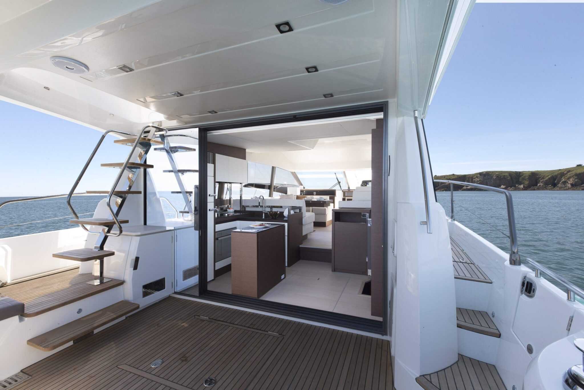 A hajó rendelhető „flybridge” és „coupé” kialakítással is. Előbbinél rendkívül praktikus és kényelmes nyitott felső fedélzetet alakítottak ki megfelelő méretű kormányállással, amely mögött újabb „társalgó” található. Ez egy kisebb társaságnak még így is tökéletes közösségi tér, de a hajó orrában is kialakítottak egy napozóteraszt, ahol további heverésző vendégek csatlakozhatnak a társasághoz.