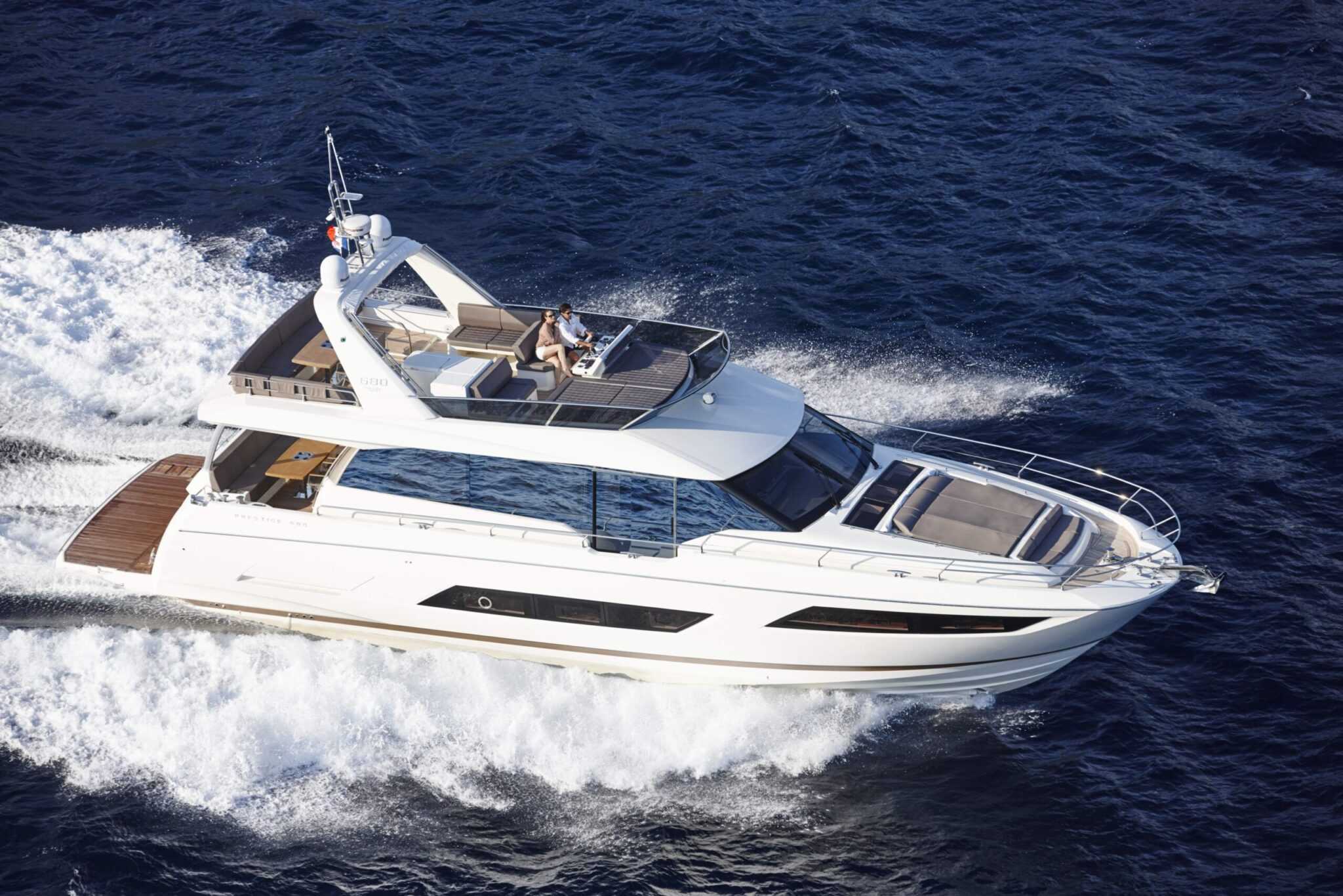 A Prestige motorosok merész és időtlen eleganciát sugalló vonalai azonnal szembetűnnek a 680-as hajótestén. A jacht minden részletét igényes gondossággal alakították ki, kiemelkedő minőségű anyagok használatával, mint a corian pultok és a tík járófelületek. A high-tech kompozitanyagok használatával létrehozott könnyű és erős hajótest szerkezeti kialakítását a két Volvo IPS 1200 motor elhelyezése határozta meg.