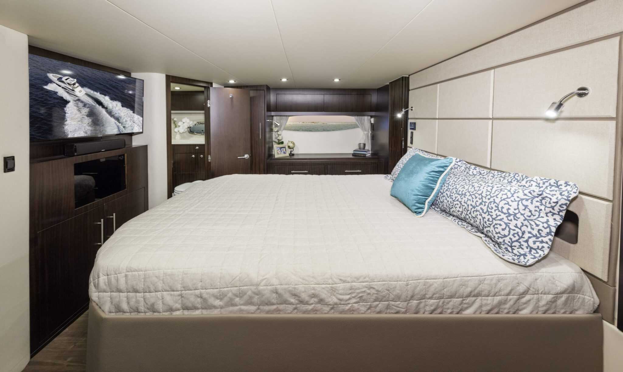 A hajó meghajtásáról 2 darab 550 lóerős Cummins Diesel motor gondoskodik. Ez már valóban komoly teljesítmény, meg is tolja rendesen a luxusjachtot. A motortér a hátsó fedélzetről nyílik, lényegében egy garázskapun keresztül juthatunk ide, minden tökéletesen hozzáférhető.