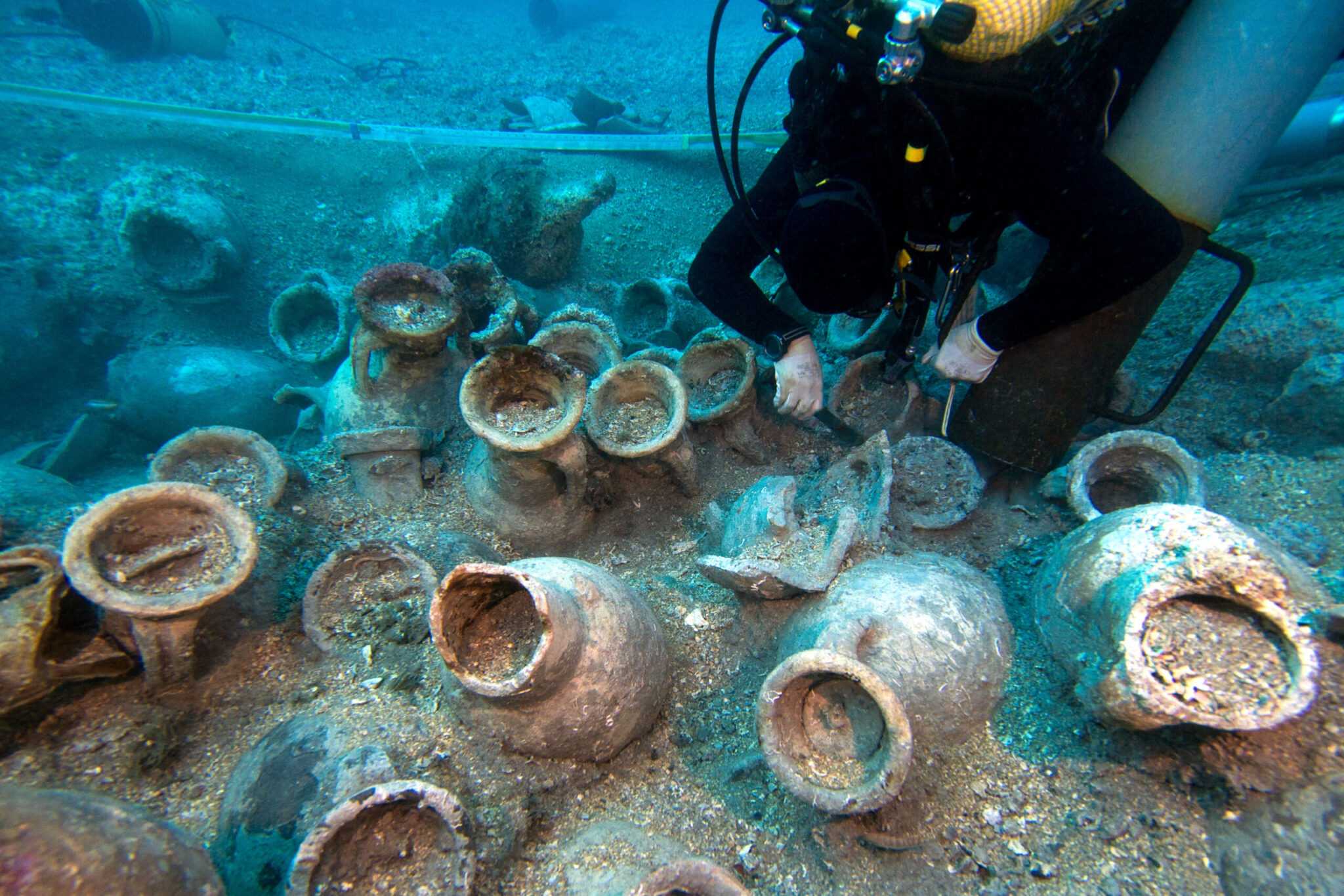 Az elsüllyedt hajó mellett amforák tucatjai hevernek több ezer éve érintetlenül, mélyen a homokban.