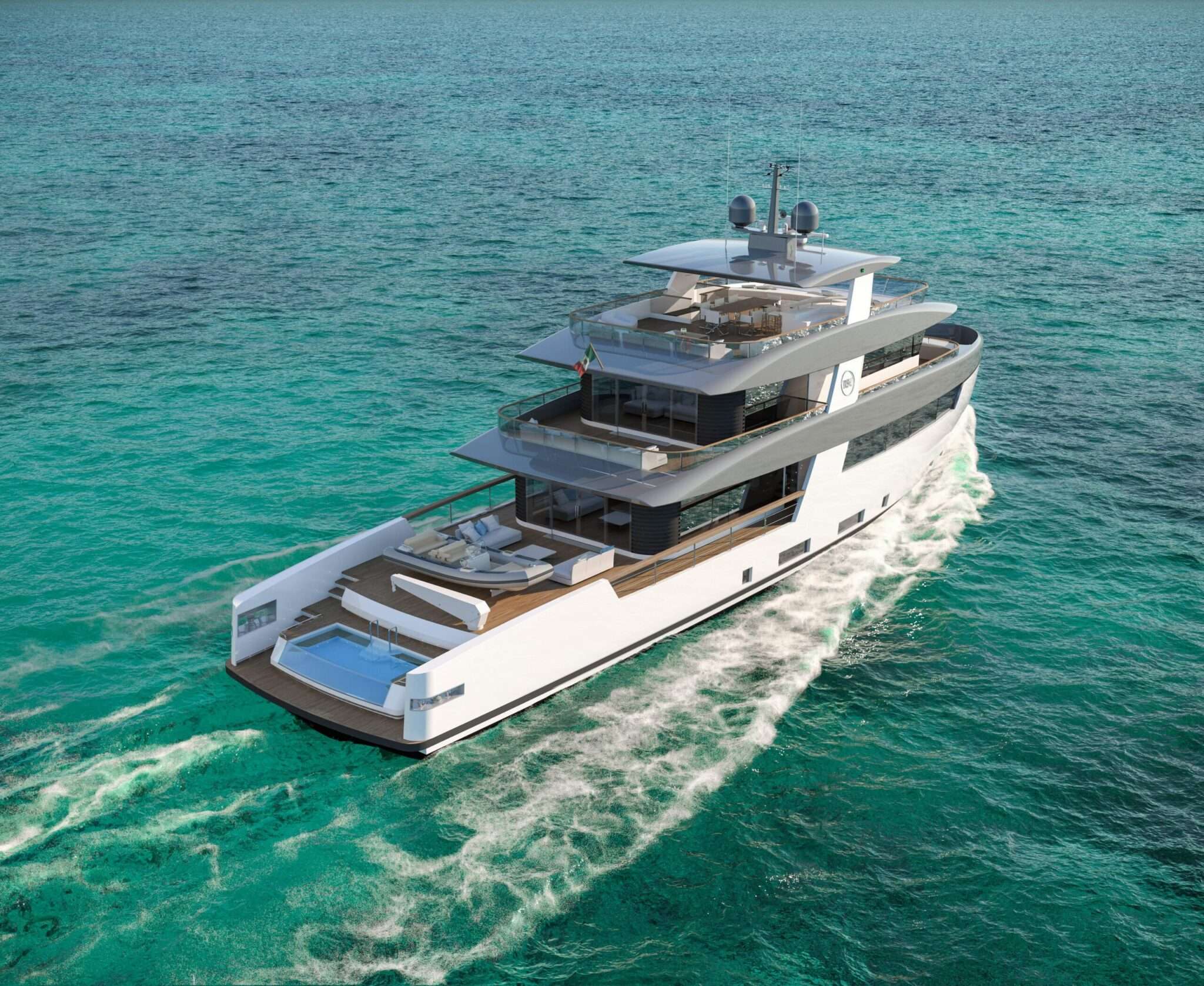 Az 50 méter hosszú modell közel 10 méter széles, így még több luxust bele tudtak álmodni a tervezők. Körbenézve elmondhatjuk, hogy igazán nem voltak szűkmarkúak. A főfedélzet tulajdonképpen kétszintes és összesen 170 négyzetméter. Itt egy komolyabb, 17 négyzetméteres medence csillog, a hozzá tartozó beach klubbal. A medence fűtött, így hidegebb időszakban is élvezetes lehet. A tender itt már egy külön garázsban pihenhet, a medencét lefedve pedig elparkolhat itt a saját tengeralattjáró víz alatti felfedezésekhez, de elfér néhány jetski vagy más sporteszköz is.