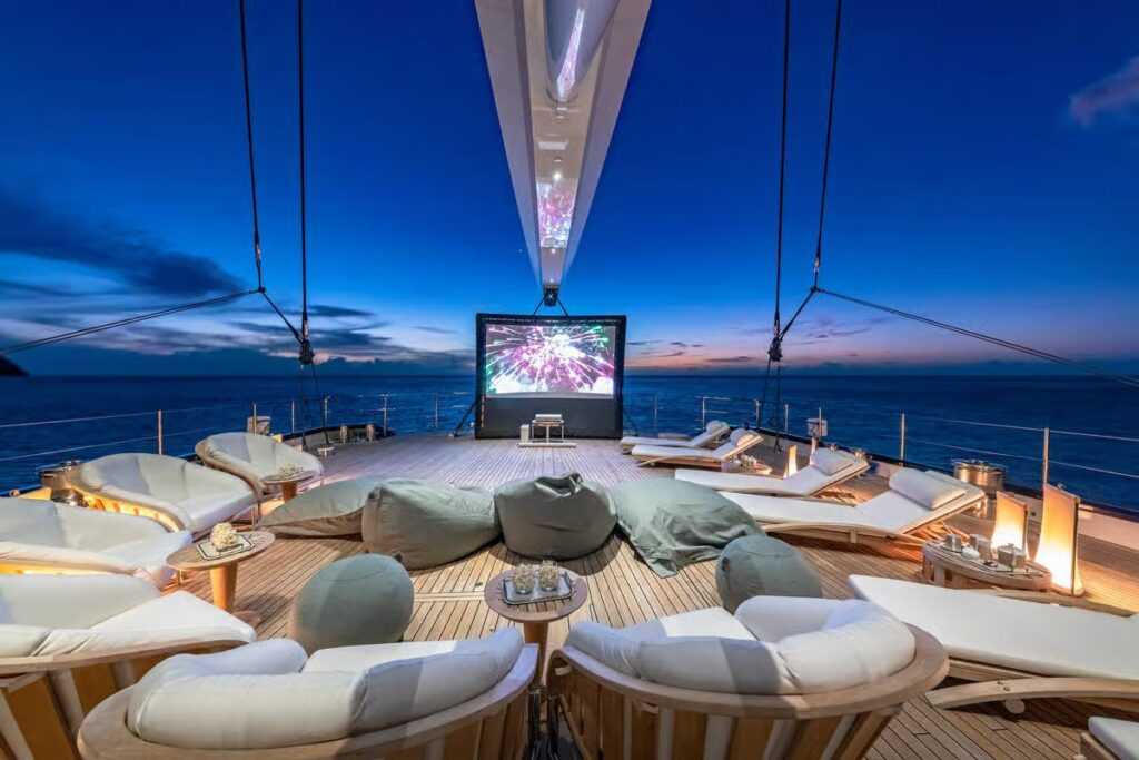 A főfedélzeti szalon és a külső fedélzet között egy elhúzható üvegfal található, amely küszöb nélküli átjárást biztosít, és nyitott állapotban egy egybefüggő teret hoz létre. A központi elem egy U alakú bárpult, amely mindkét térből elérhető, így a vendégek kényelmesen élvezhetik a panorámát és a társasági életet.