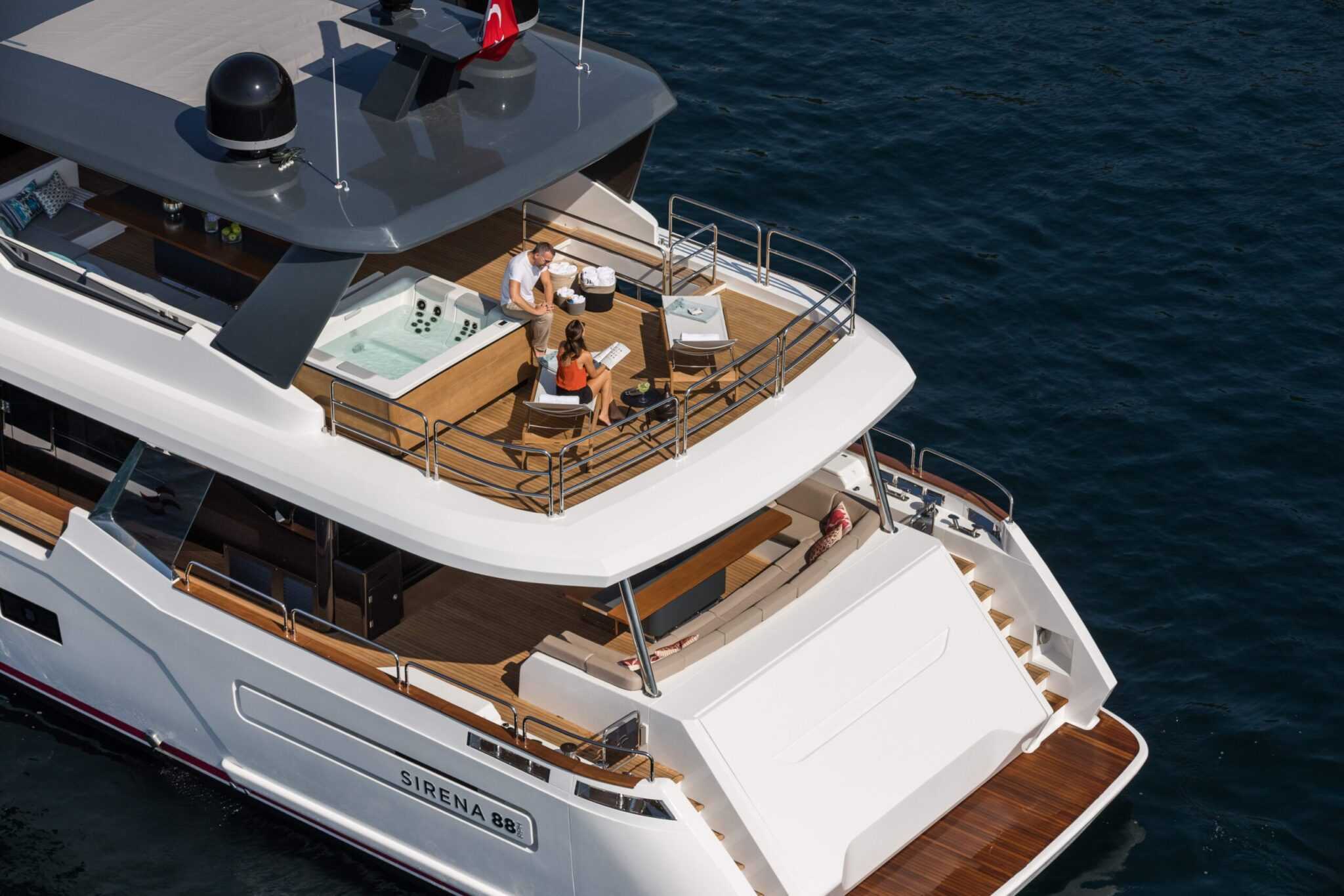A személyzeti szállás és a kormányállás jól szeparált és külön közlekedőkön keresztül elérhető, így a személyzet nem zavarja a pihenő vendégeket. A felső fedélzet teljes egészében a vendégeké, bárral, jakuzzival, elhúzható panorámatetővel és hatalmas napozóágyakkal szolgálja a pihenést. A tulajdonosi lakosztályból közvetlenül elérhető a privát első fedélzet, ahol szintén jakuzzi és napozóterasz kényezteti a tulajdonost.