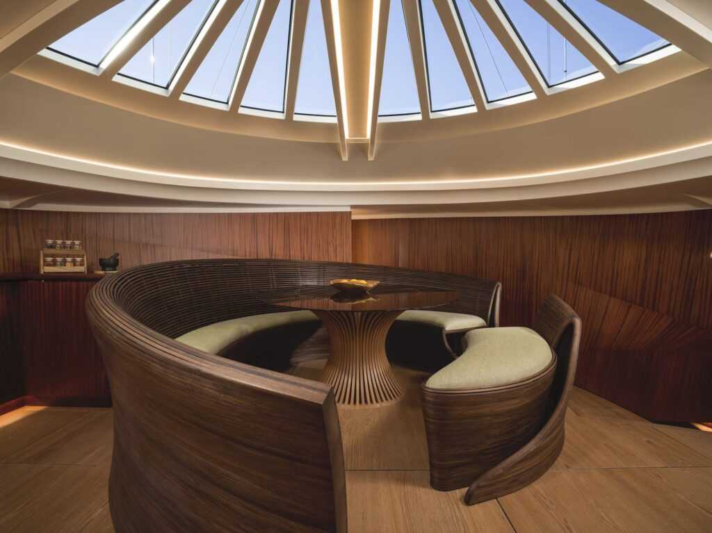 A falak és a válaszfalak S alakban folynak át a belső tereken, amelynek természetes megjelenése és érzete a sipo, a tík, valamint az amerikai dió kombinációjának köszönhető. A szalon központi eleme a különlegesen ívelt, gőzölt amerikai dió ülőgarnitúra, amelynek anyaga a tulajdonosi és a VIP-kabinokban is visszaköszön. A diszkrét ajtókat fogantyúk helyett rejtett érzékelők nyitják, ezzel biztosítva a sima vonalakat és az elegáns megjelenést.