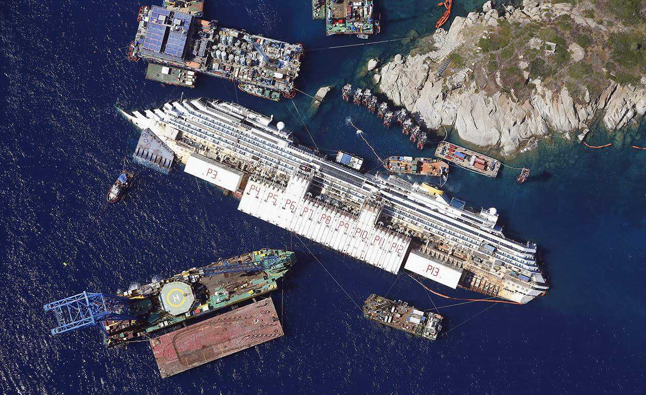 A Costa Concordia roncsát négy vontatóhajóval a genovai kikötőnek abba a medencéjébe húzták át, ahol a megsemmisítésre ítélt hajók utolsó darabjait szedik szét. Mint minden más hajó utolsó útján, a kikötő szirénája most is megszólalt a tengerjáró búcsúztatására. A Costa Concordiából már csak a legalsó emeletek rozsdás váza áll, ezt is darabokra szedik.