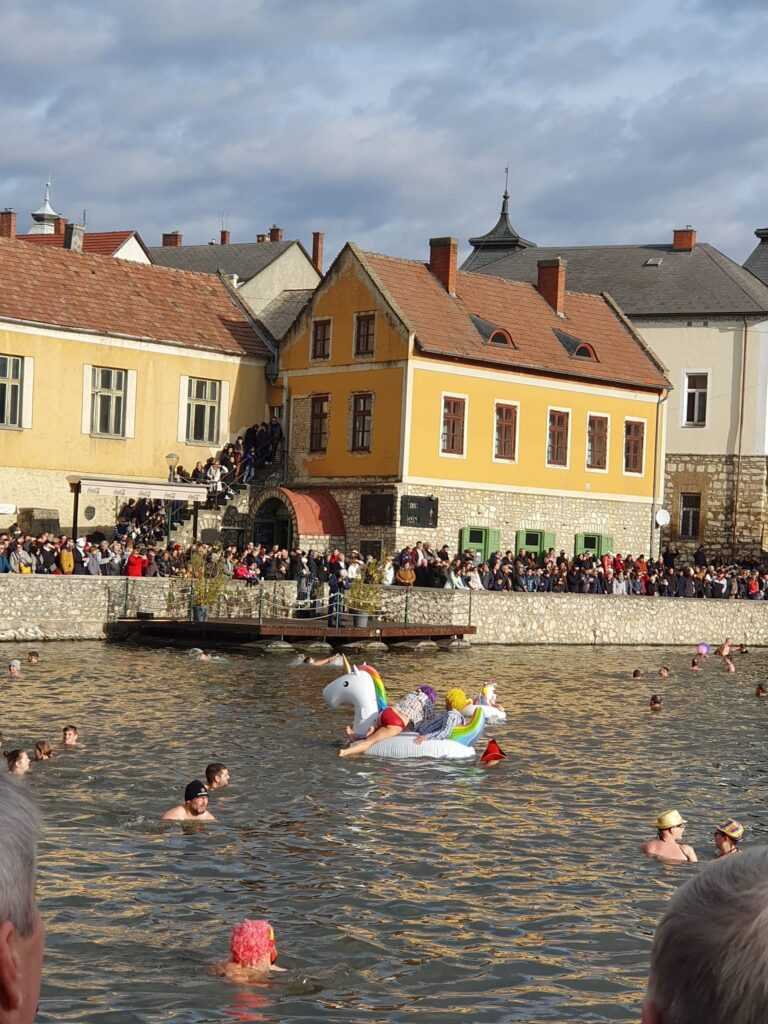 Immár tizenharmadik alkalommal lett szabad a fürdés lehetősége szilveszterkor a vidám csobbanni vágyók előtt a Malom-tóban, ahol ezúttal 281-en fürödtek.