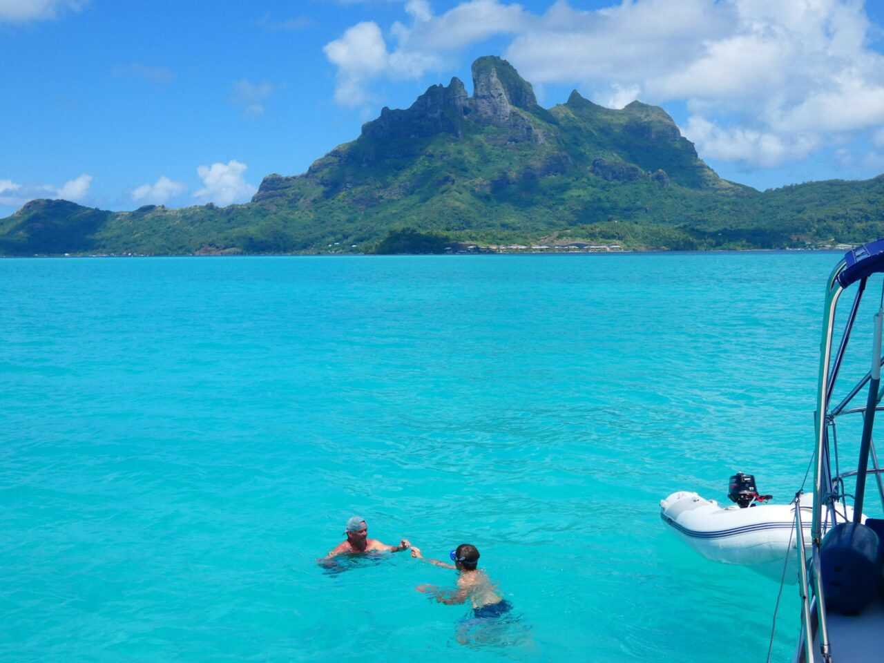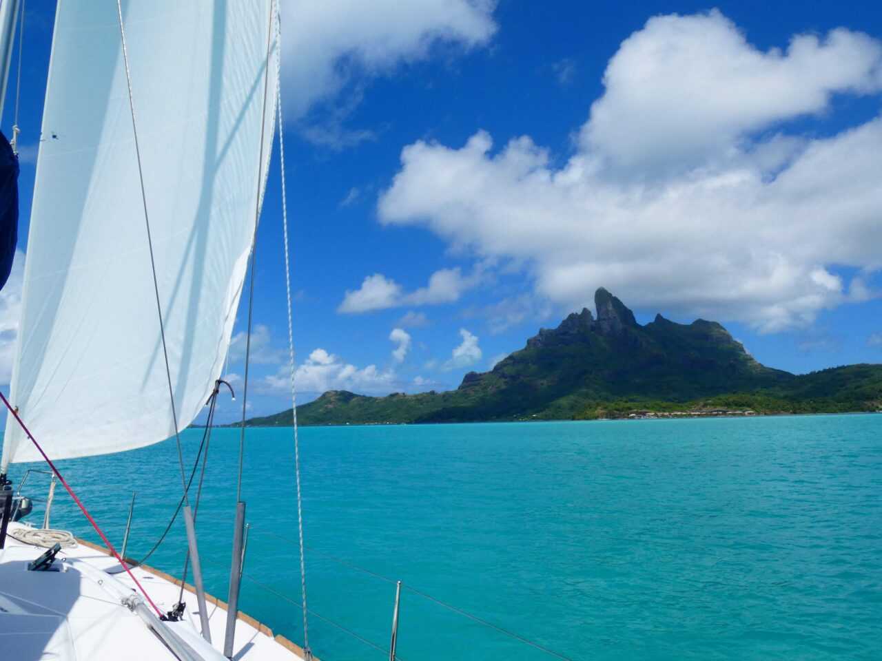 Innen Bora Borára vezet utunk, 20 mérföld hajózással passzázstól passzázsig. Ez Polinézia Gyöngyszeme, a világ legszebb szigetének tartják. Korallgyűrűjének egyetlen bejárata a sziget szél alatti, nyugati oldalán kínálkozik. Laterális bóják és feltakaró jelek segítenek a behajózásban. Ezen a nyugati szigetoldalon a belső lagúna mély vizű, ezért is mélykék a színe. Horgonyzásra túl mély lenne, de telepített bójákon alhatunk a Bora Bora Yacht Club és a Maikai Yacht Club előtt. Impozáns hegy uralja a szigetet, és hajóval majdnem körbejárható a korallgyűrű határolta belső lagúnában. A türkizkék és tengerzöld sekély vizű lagúna, amiről Bora Bora híres, a sziget keleti felén található. Habár ez a sziget szél felőli oldala, a korallgyűrű itt széles szigetek sora trópusi növényzettel, amelyek mérséklik a szélerőt, a hullámzást pedig lefogják. A friss víz viszont beáramlik közöttük. A keleti lagúnában a vízmélység 6 mérföld hosszan 2-3 méteres, és nagy korallfejek között kell szlalomoznunk. A St.Regis Resort vízi bungalói előtt aludhatunk horgonyon, szemben vele reggelente mantákkal lehet úszni. A szárazföldi látnivalókhoz motort érdemes bérelni. Bora Bora csupán 32 km körben, kiváló minőségű aszfaltúton. Vaitape a fő település, szupermarketjében bevásárolhatunk. Néhány kilométerrel tovább elérünk a Bloody Mary étteremhez, amelynek a bejáratában két tábla van teleírva a hírességek nevével, akik előttünk jártak itt, hajóval is megközelíthető.