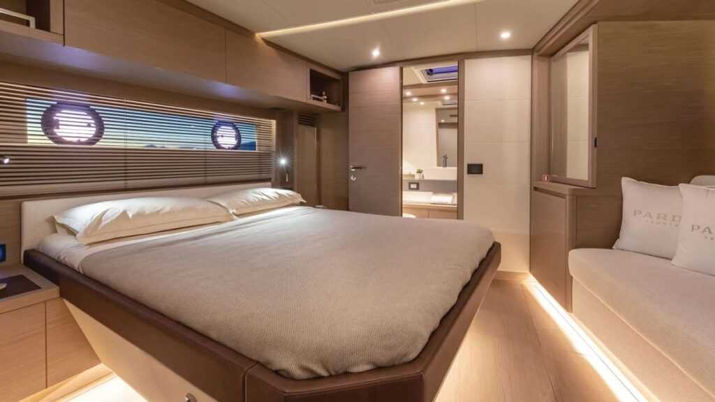 A beépített mosogatógéppel, mikrohullámú sütővel és teljes méretű mosogatóval felszerelt konyhán keresztül a világos és tágas tulajdonosi kabinba jutunk, ahol „King size” franciaágy, ülőgarnitúra és zárt zuhanyzóval épített, méretes fürdőszoba található. A meglehetősen grandiózus VIP-kabinban – amely két, a szokásosnál szélesebb egyszemélyes ágynak ad otthont – külön WC-t és zuhanyszekciós fürdőszobát használhatnak a lakók, míg a kormányállás bal oldali ülései alatt egy harmadik kis kabin is kialakítható (a „galley-up” modelleken). Ez hivatalosan a legénység számára van fenntartva, de a legtöbben inkább gyerekeknek vagy utolsó pillanatban érkező vendégeknek szánják.