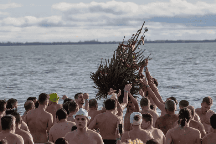 Nem csak a hideg a próbatétel: a fürdőzőknek egy karácsonyfát is meg kell szerezniük a vízből. Ez persze csak az igazán elszántaknak sikerülhet, akiket nem renget meg az sem, hogy a feladathoz teljes testtel be kell menniük a Balatonba.