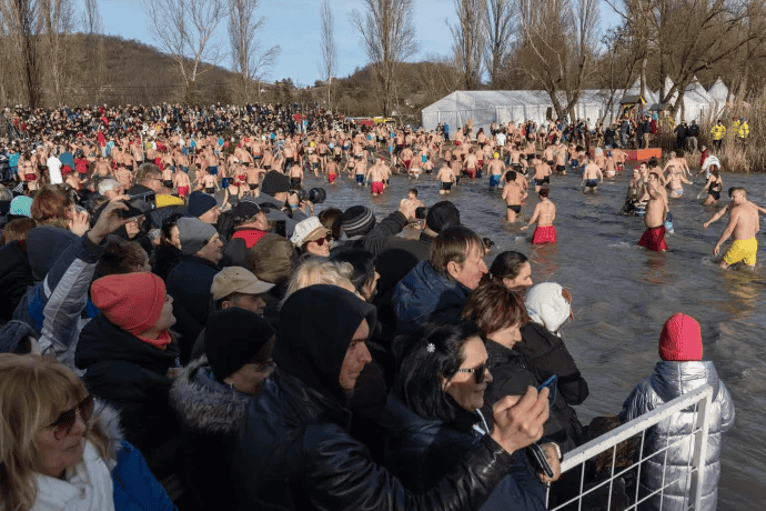 Az idén 3 fokos volt a víz, a fürdőzőket forralt borral és meleg teával várták a parton – írta a telex.hu.